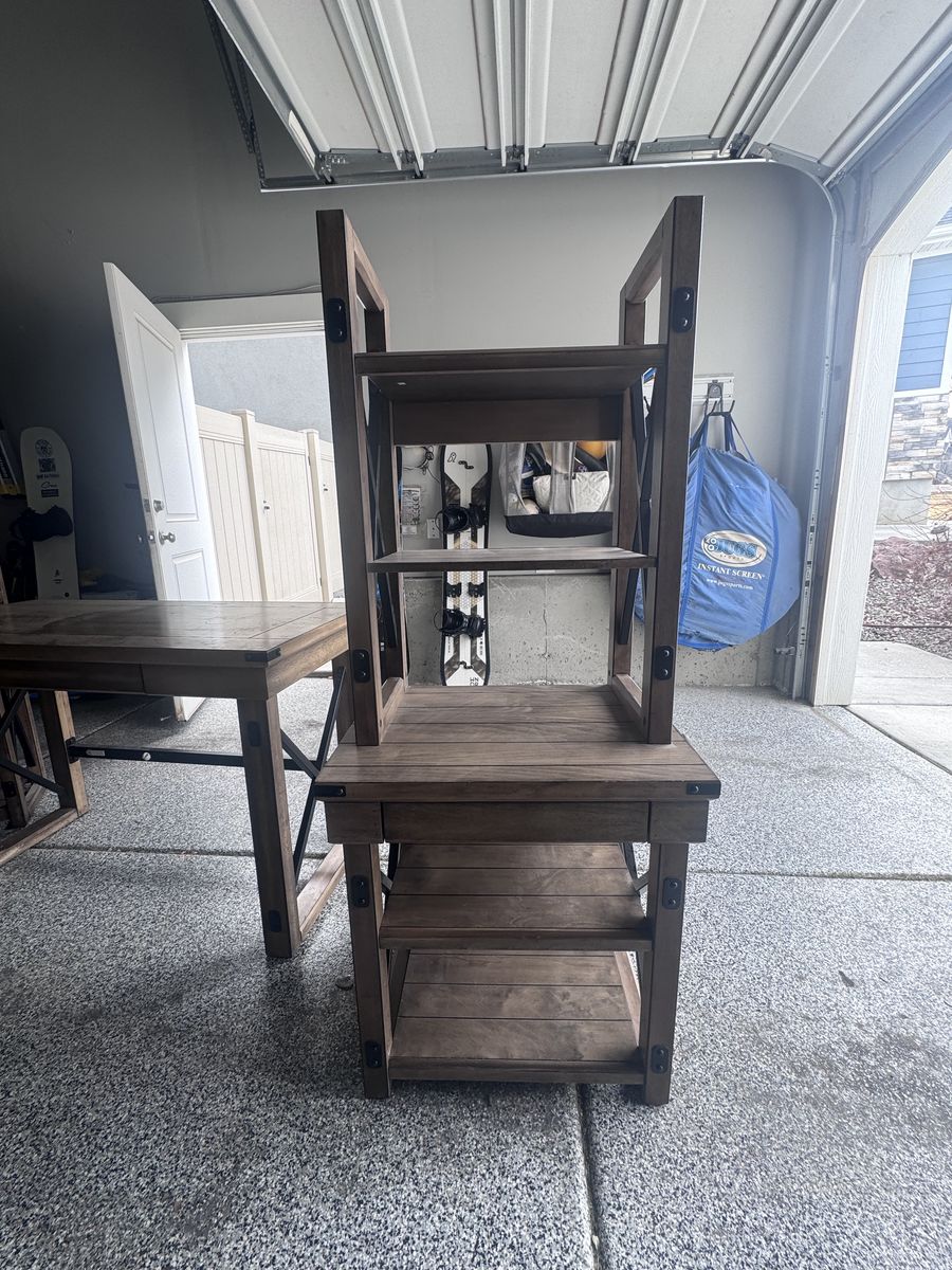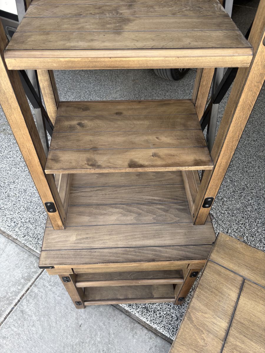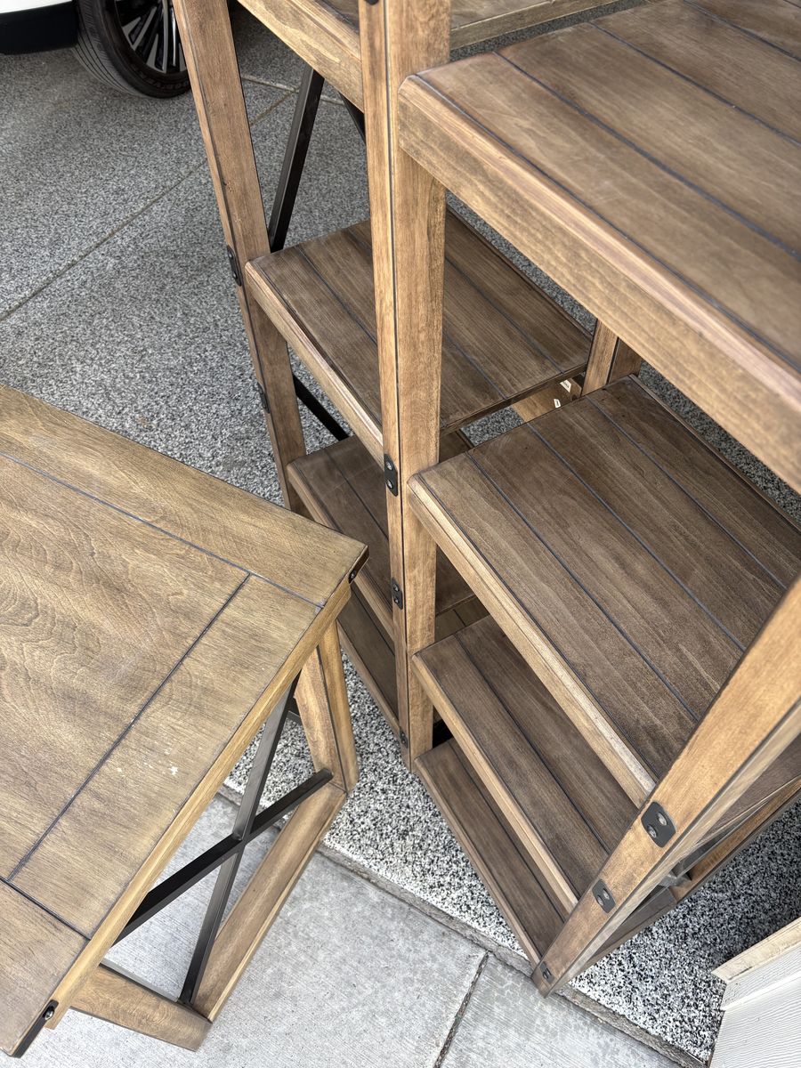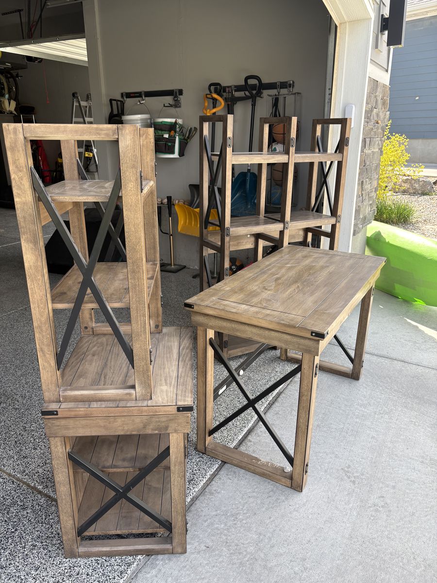 ApplePay3 piece office furniture or living furniture set. In good shape, I am the only owner, owned for a few years. Lighter brown wood with wire brackets. Comes from a smoke free home and is sturdy and well built. Includes the following measurements: