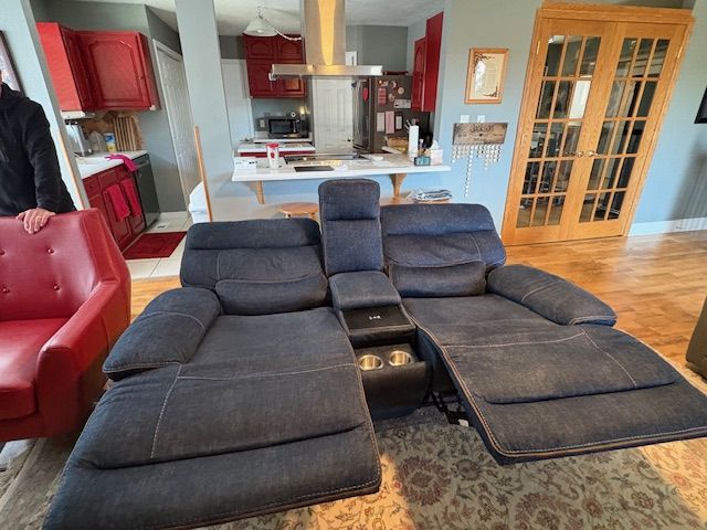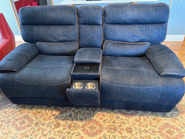 VenmoBlue Denim loveseat with two powered recliners and powered charging port and USB outlets and cupholders.
