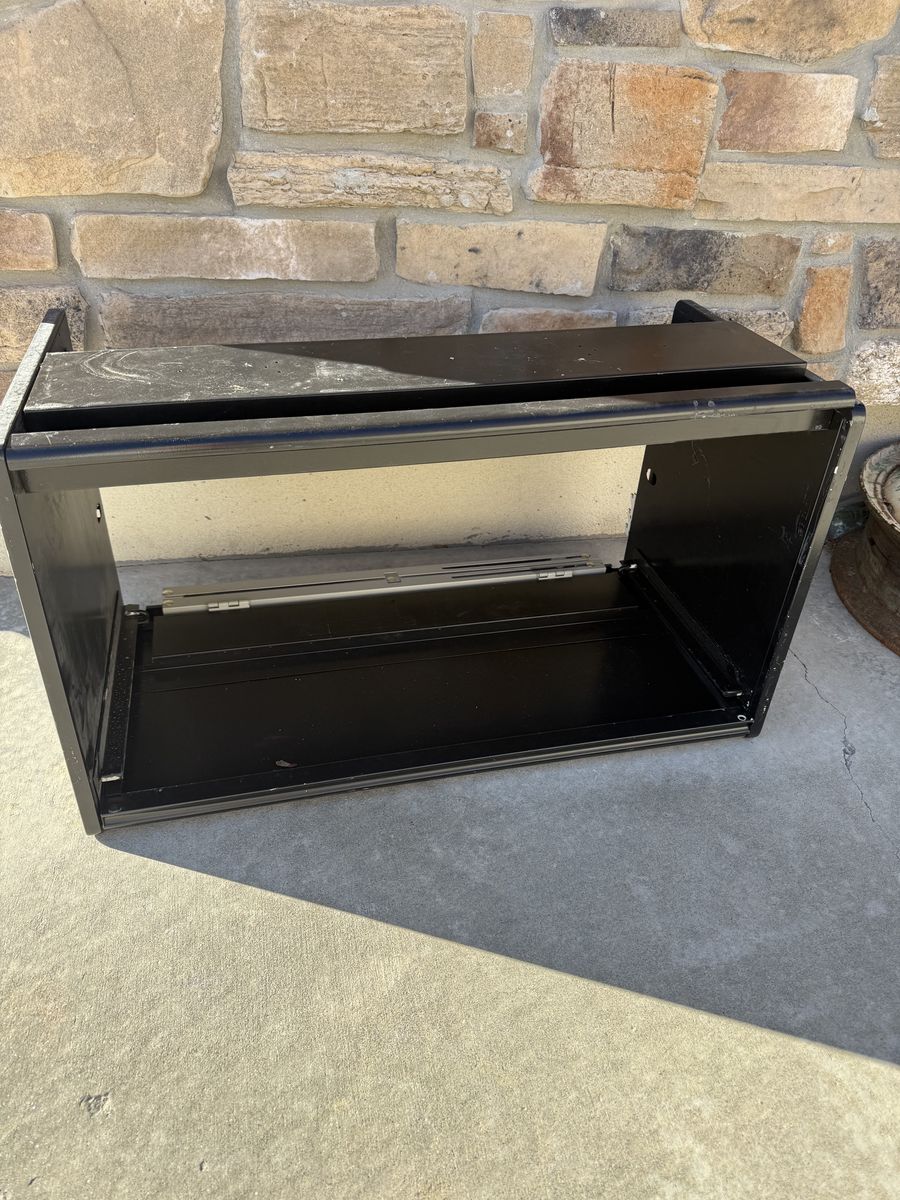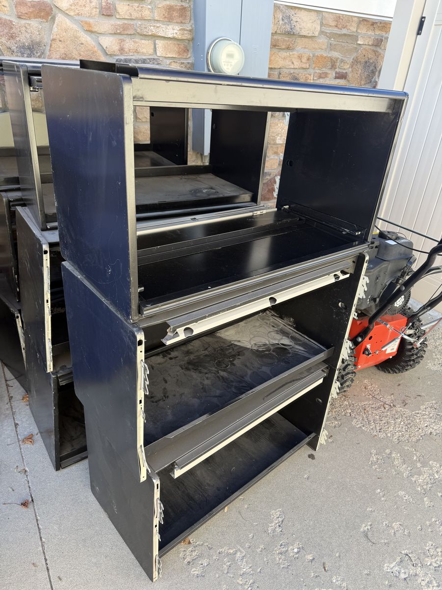 VenmoThese metal box shelves are 15” high by 30”wide by 17” deep. We have 15 of them. They have a closure that can stay up or down.