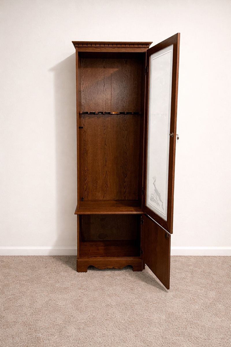 Beautiful solid oak gun cabinet with etched glass door and locking storage. Very sturdy and well built. Holds up to 8 guns and is great for displaying rifles or shotguns while keeping them secure. Both the upper and lower cabinet lock.
