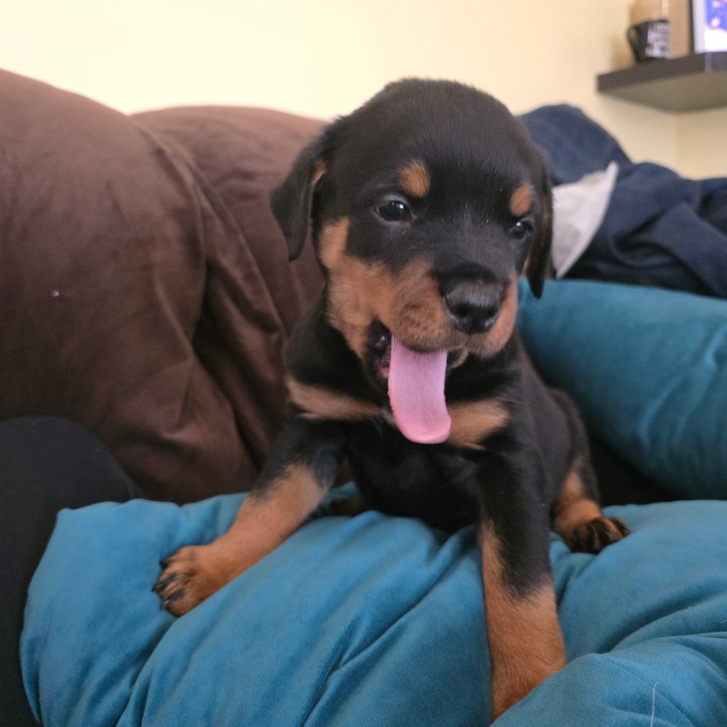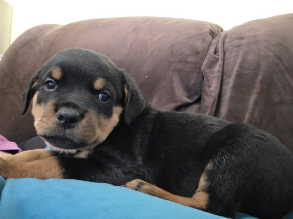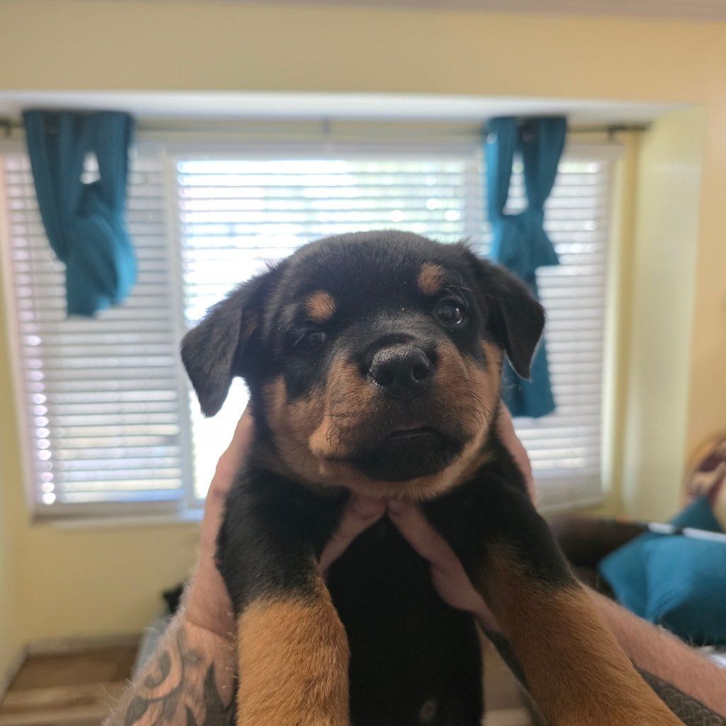 purebred male Rottweiler puppie ready to go to their new family. Born February 3rd. Tail docked and first shoots done. Mom and Dad on site for your viewing.