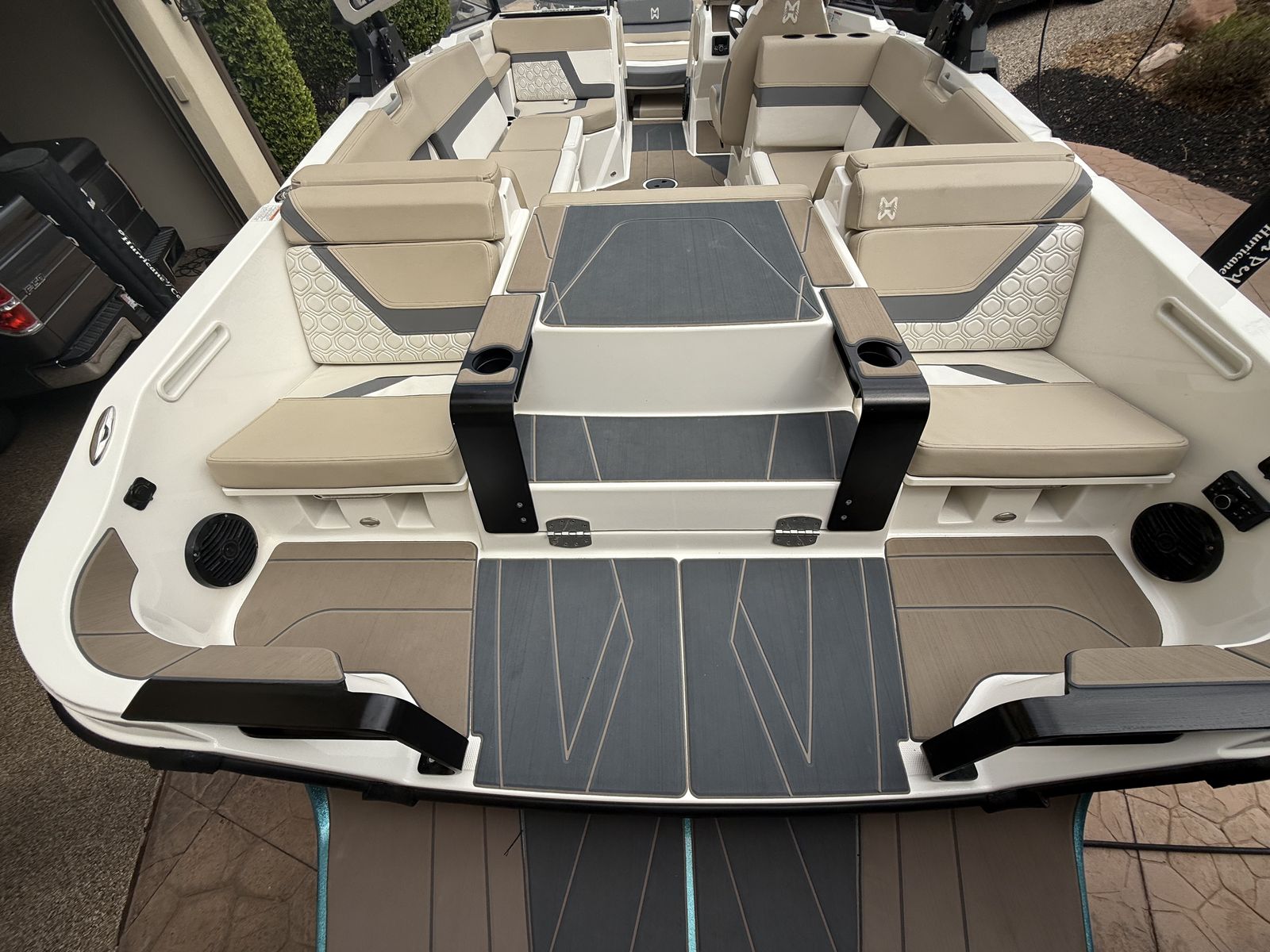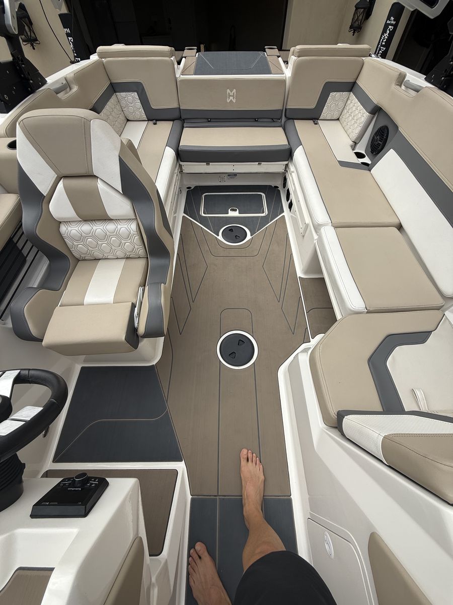 Features: Simrad touchscreen helm display with engine monitoring and cruise control, folding wake tower with board racks and tower speakers, Rockford Fosgate premium sound system, rear-facing transom seating to watch riders, large wrap-around interior seating, captain’s chair with flip-up bolster, tons of storage, GatorStep style flooring, multiple cupholders and USB ports, large surf swim platform with traction mat, and LED courtesy lighting throughout.