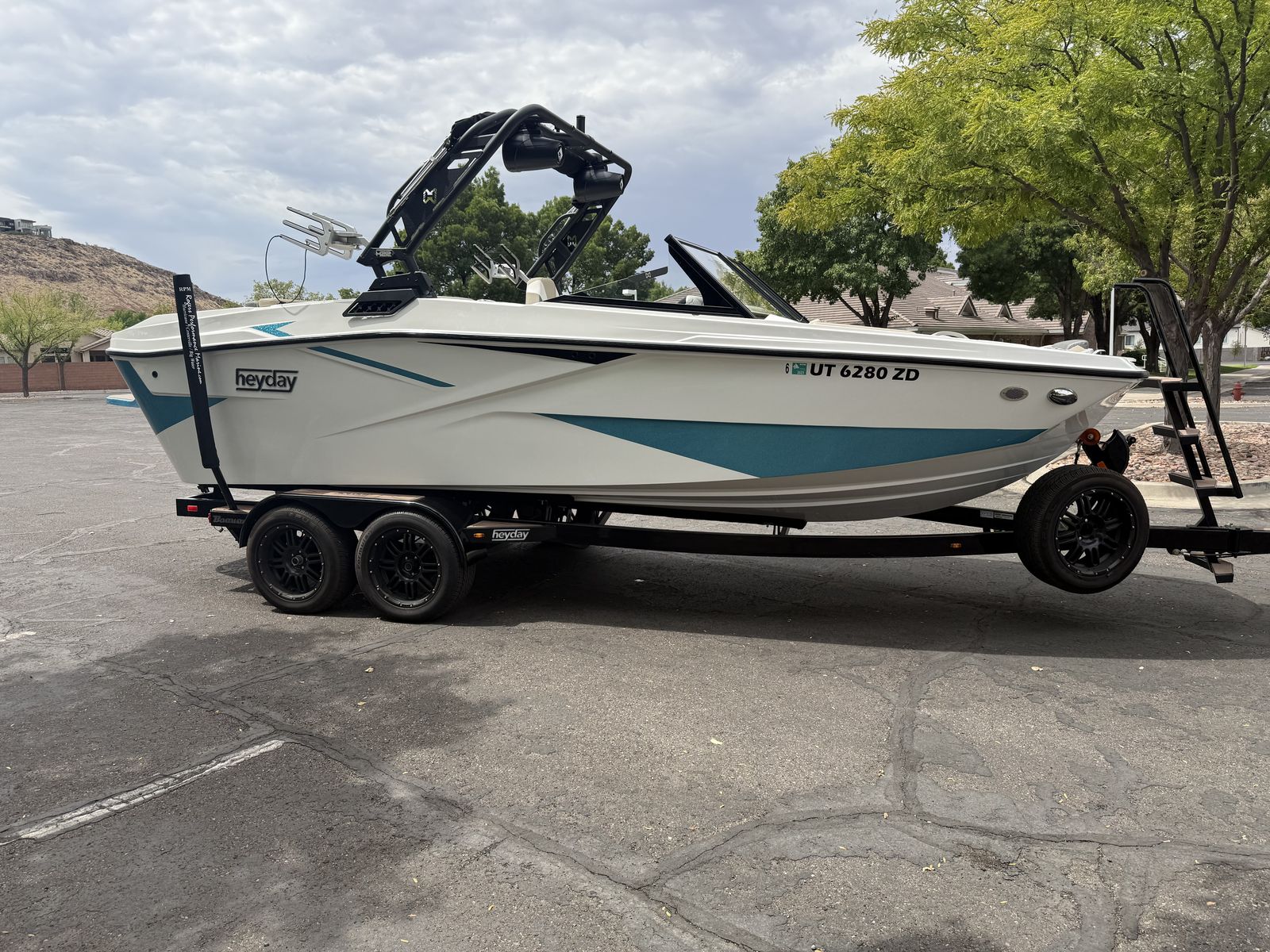 Trailer Included: Tandem axle Heyday trailer with matching wheels and swing-away tongue.