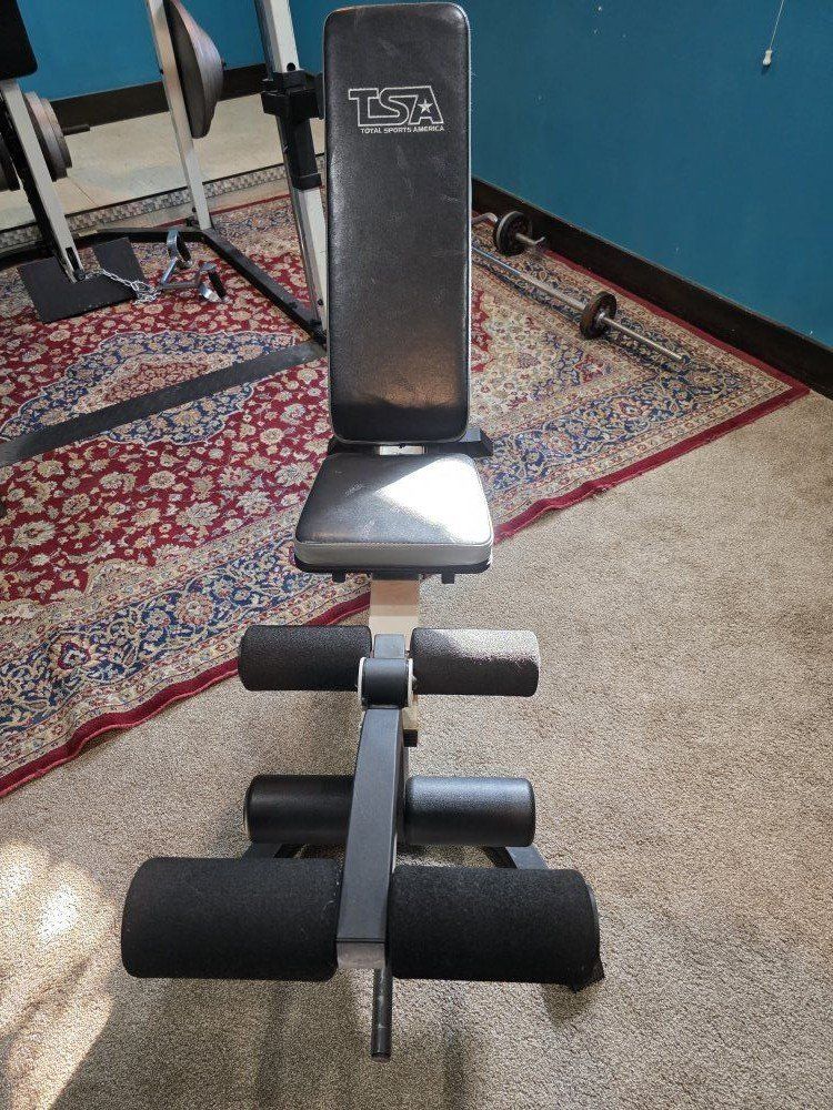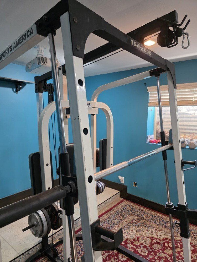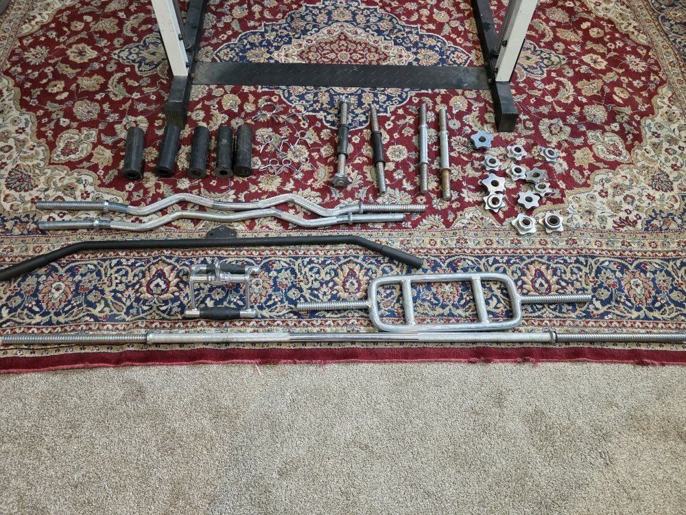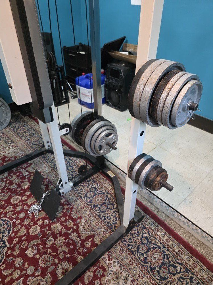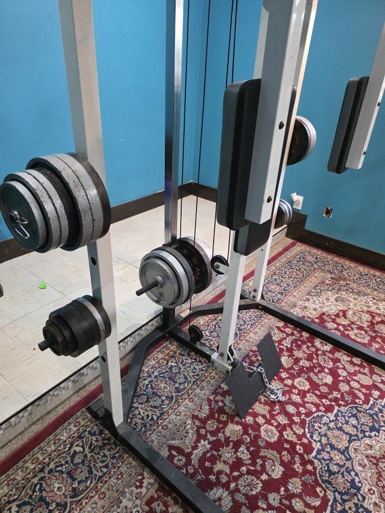 weight set. Smith machine, rack, lat pull down, low row and peck deck. comes with 275 lbs of weight and multiple bars. Bench goes from 10 degree decline to 85 degree incline has leg developer for extension and curls, and preacher bench.
