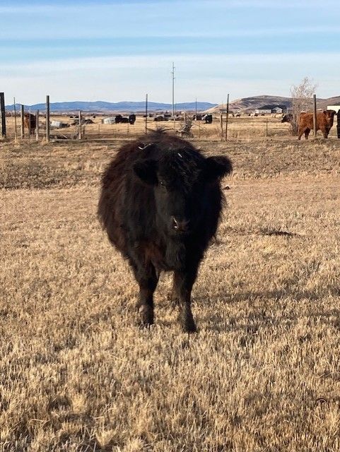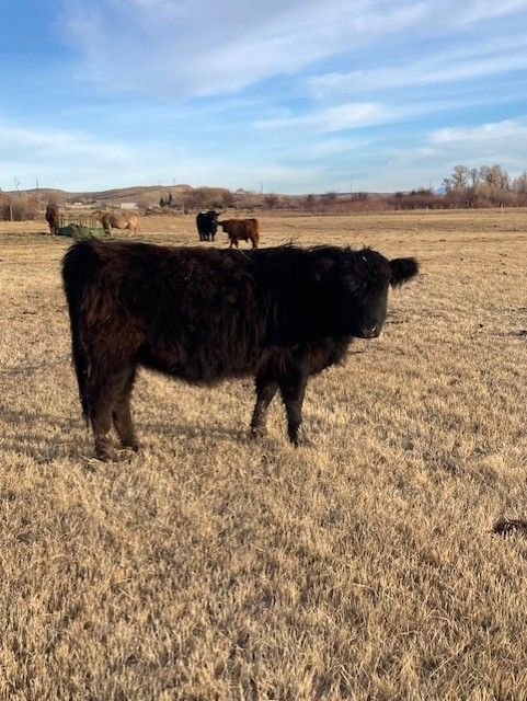 Jemma is a 2 year old 3/4 Scottish Highland 1/4 Angus Cross cow that was born on our small ranch. She was preg tested and is due around the middle of May, bred to our black Registered Scottish Highland Bull. She is naturally polled and her calf will be too, because of the Angus genetics.