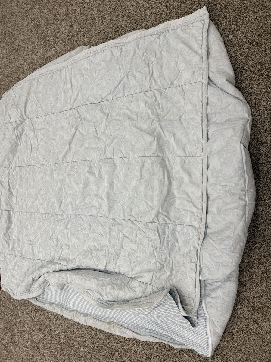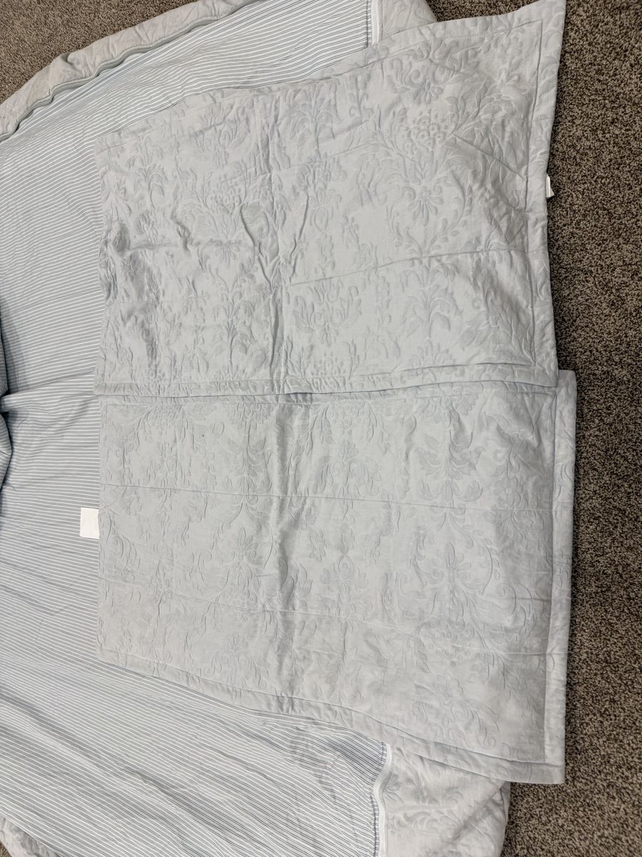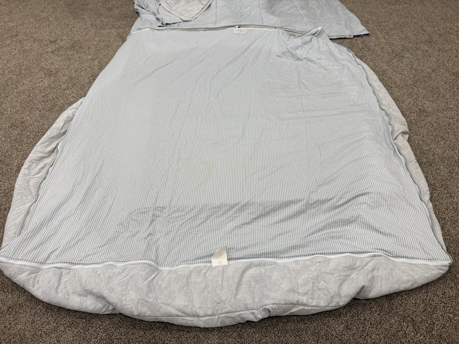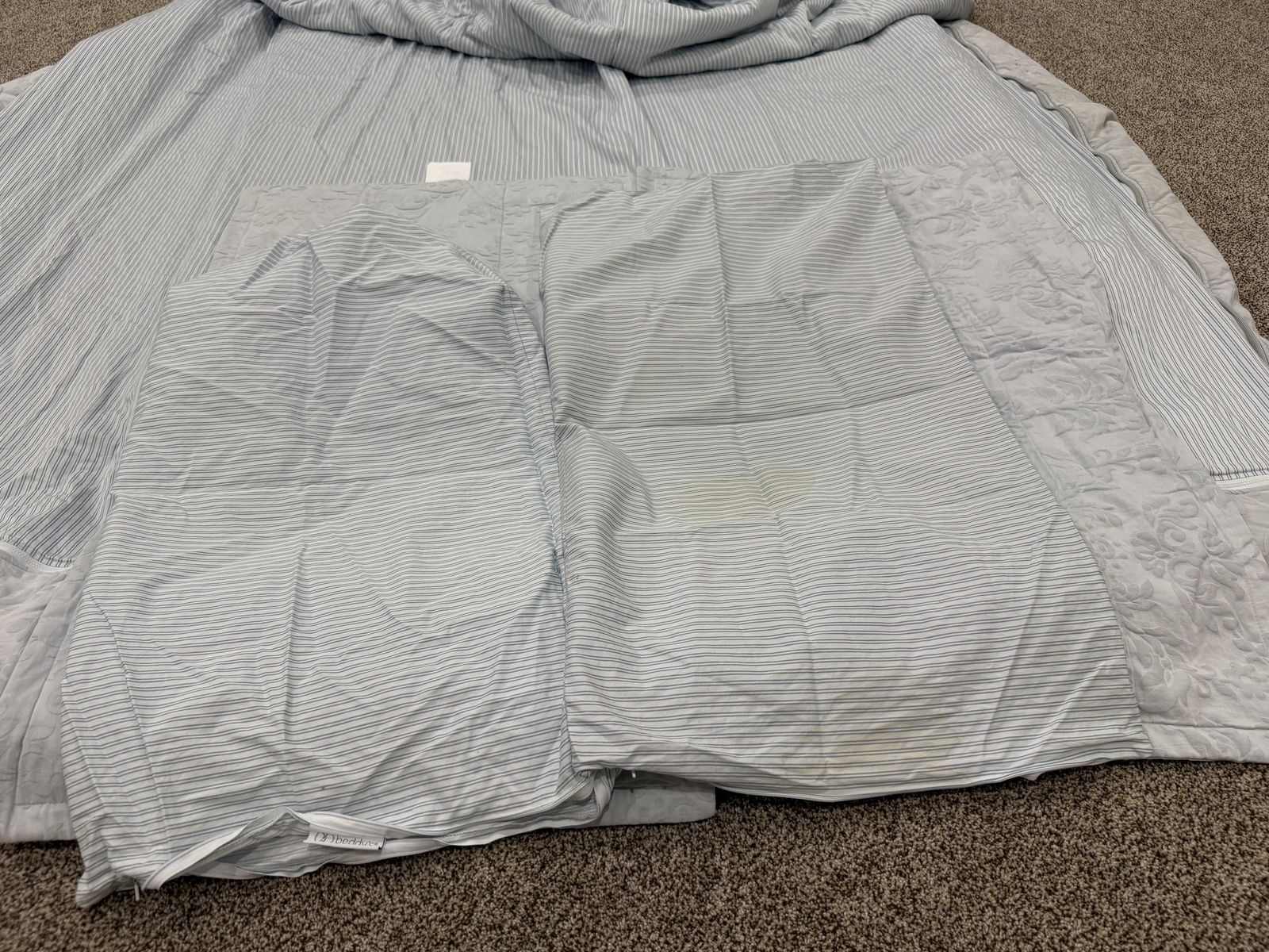 Includes 2 shams and 2 cases and 1 sheets few minor. Has some staining throughout. Zipper missing small metal clip so still zips but not as secure/reliable. Mar21