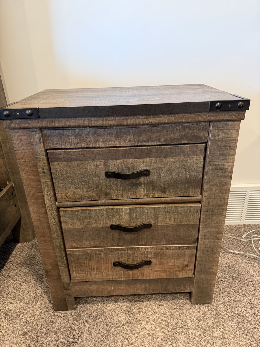 Selling lightly used bed set . 2 night stands Dresser and mirror Cal king bed
