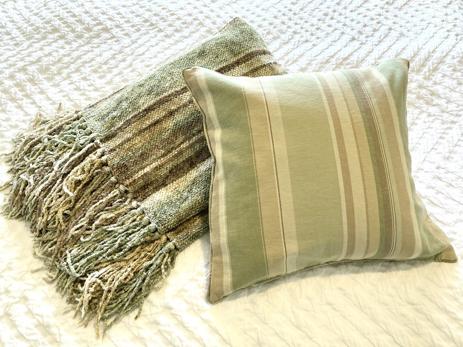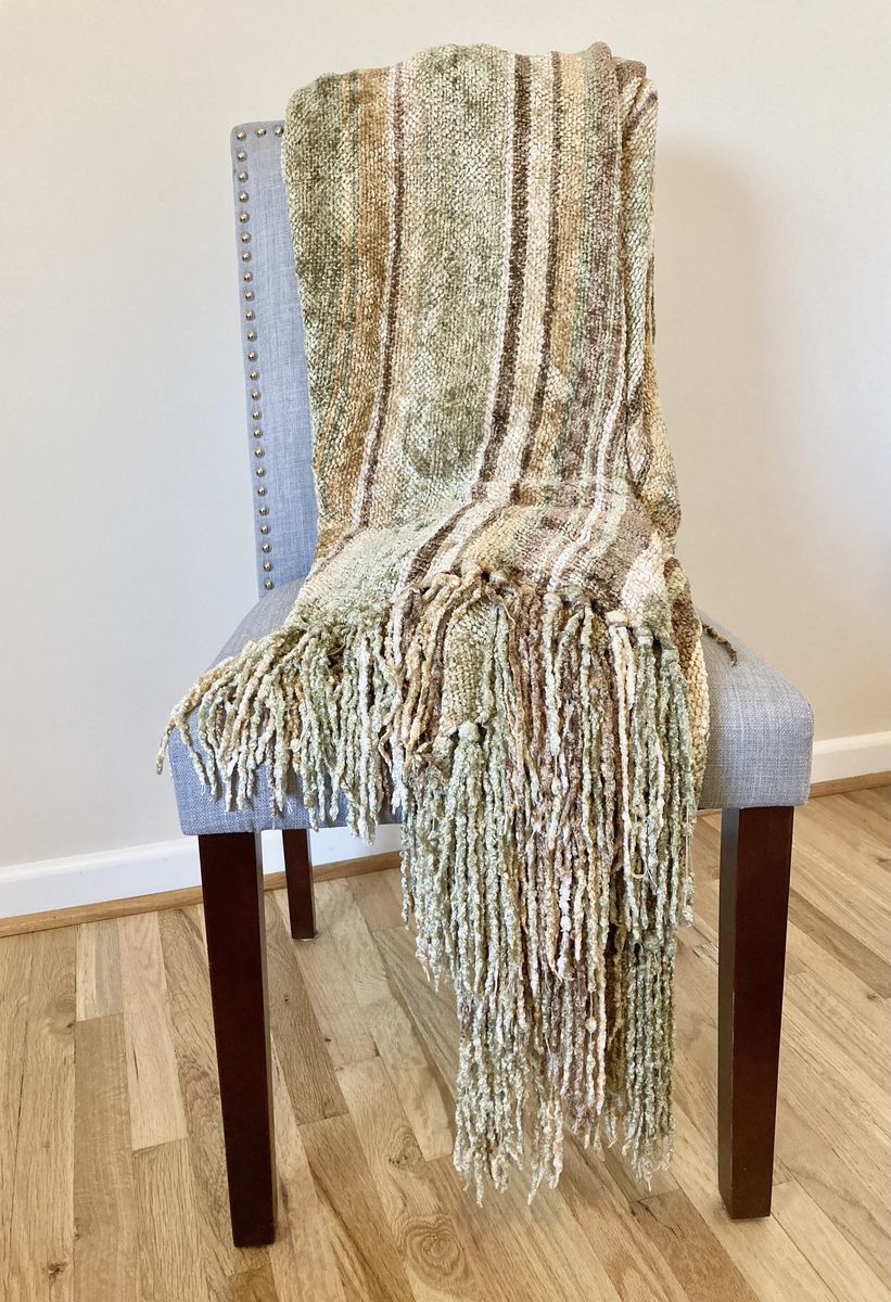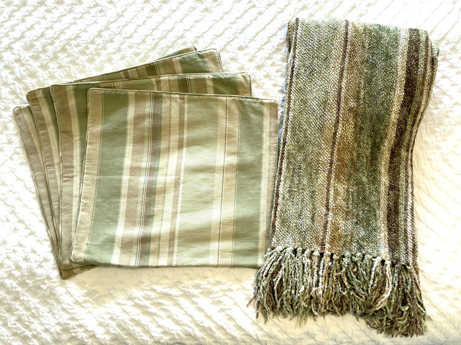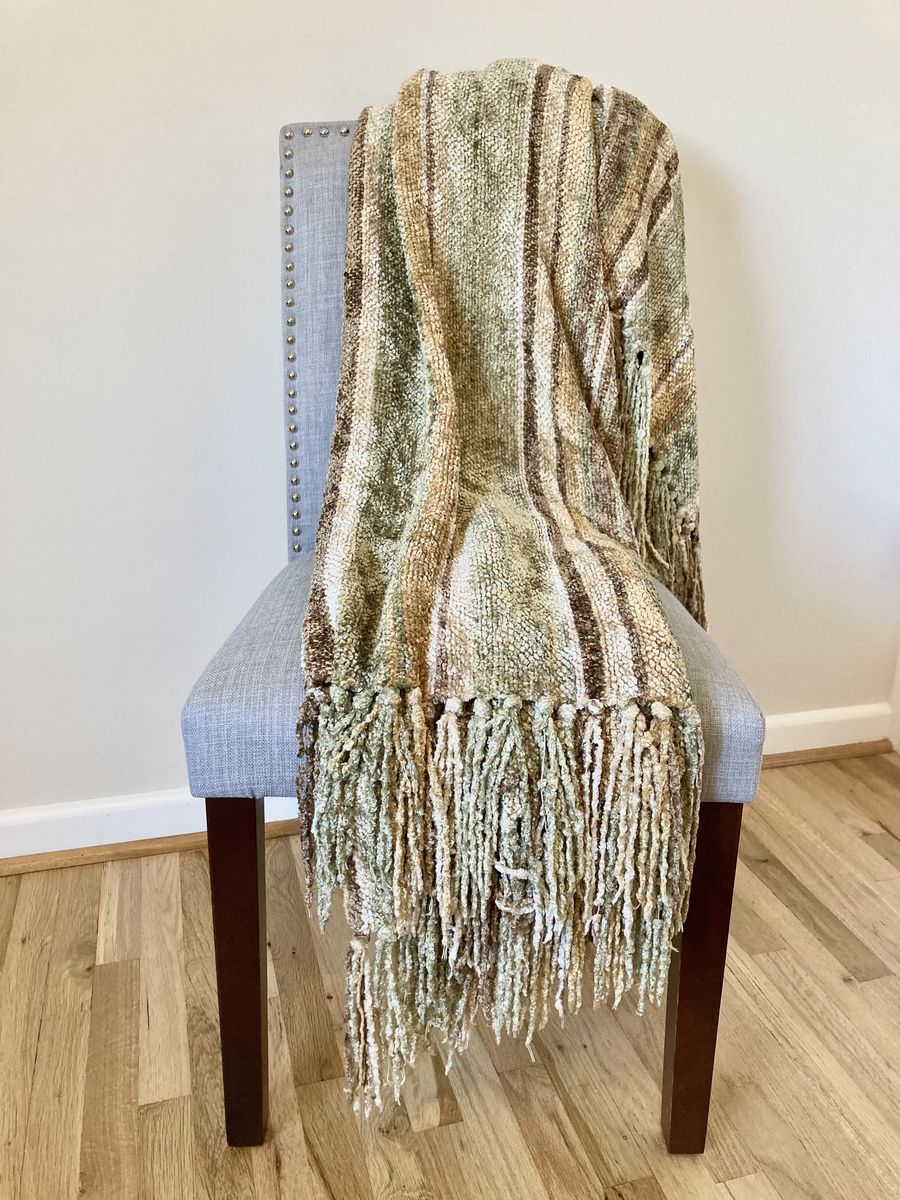 VenmoGreen, tan, brown, cream. Chenille blanket and 4 pillow covers. Pillow inserts not included. 18x18” pillow covers In great condition but a few small signs of wear (see photos) Must take the set