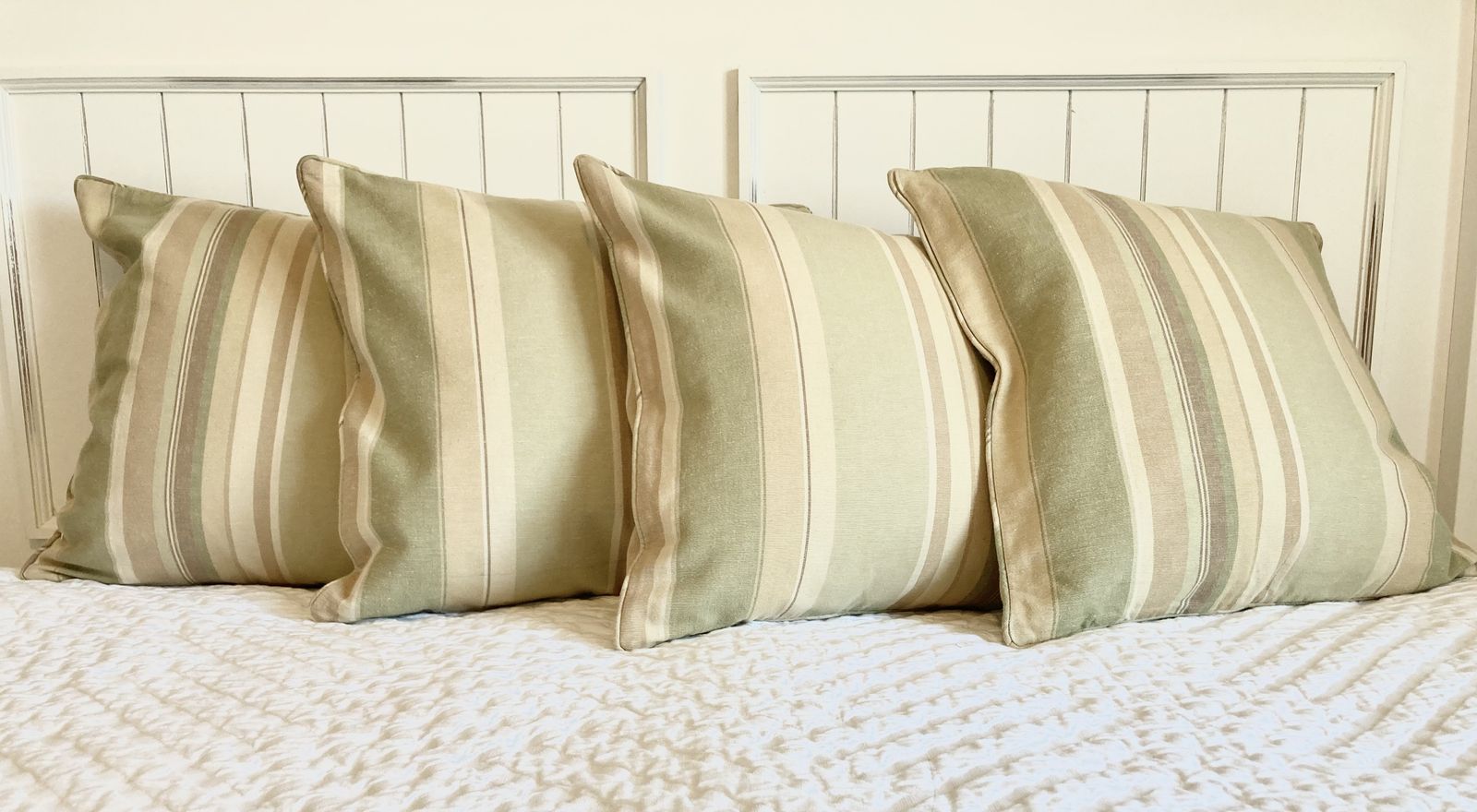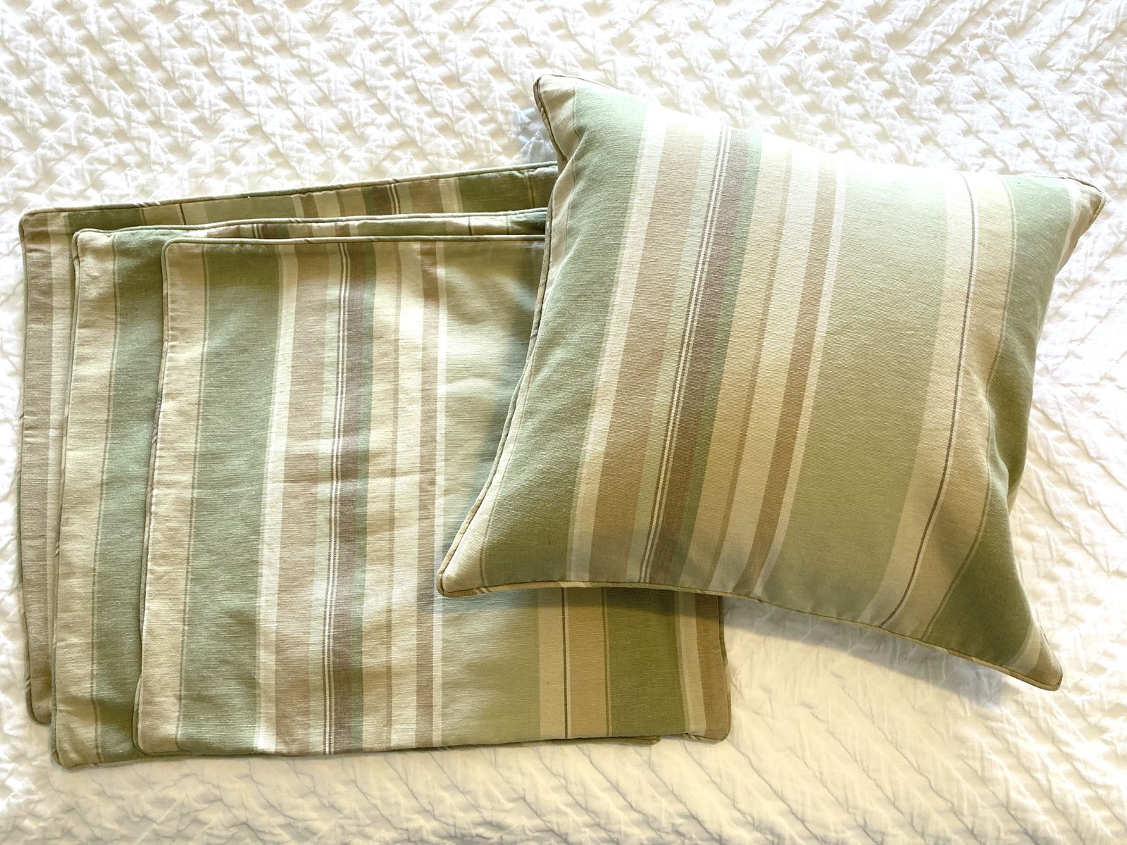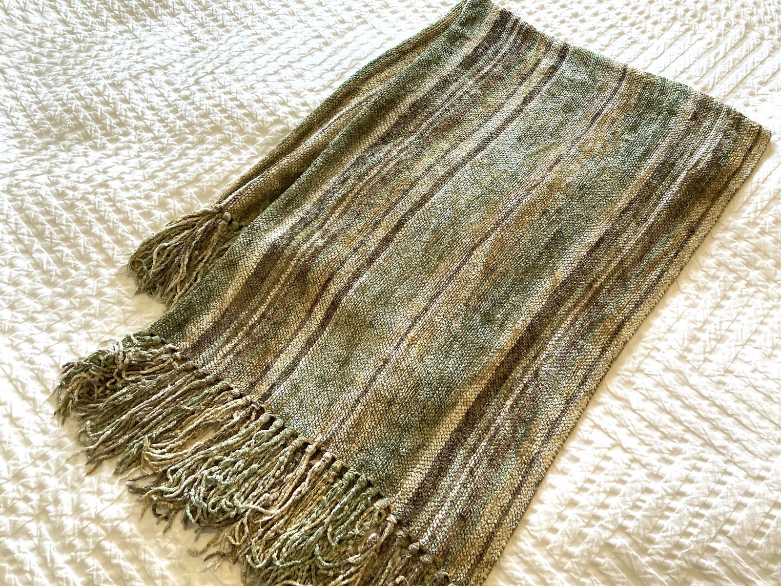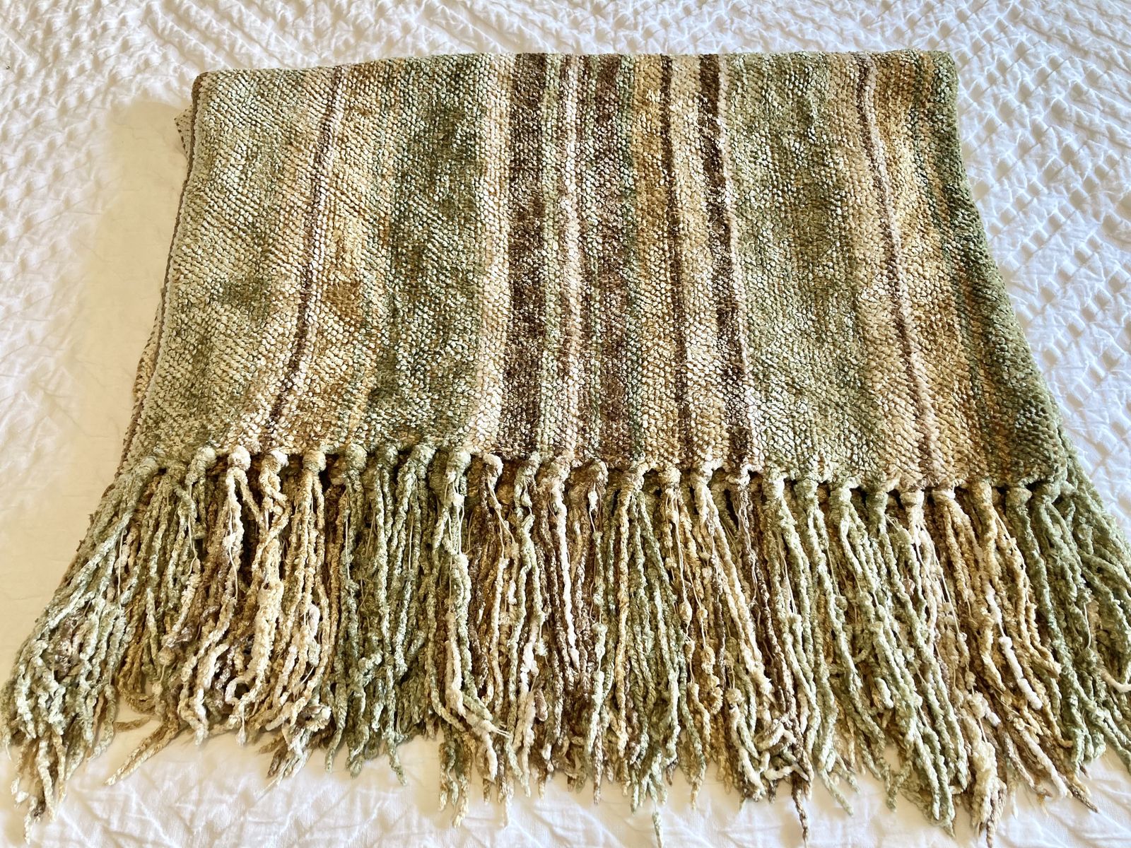 VenmoGreen, tan, brown, cream. Chenille blanket and 4 pillow covers. Pillow inserts not included. 18x18” pillow covers In great condition but a few small signs of wear (see photos) Must take the set