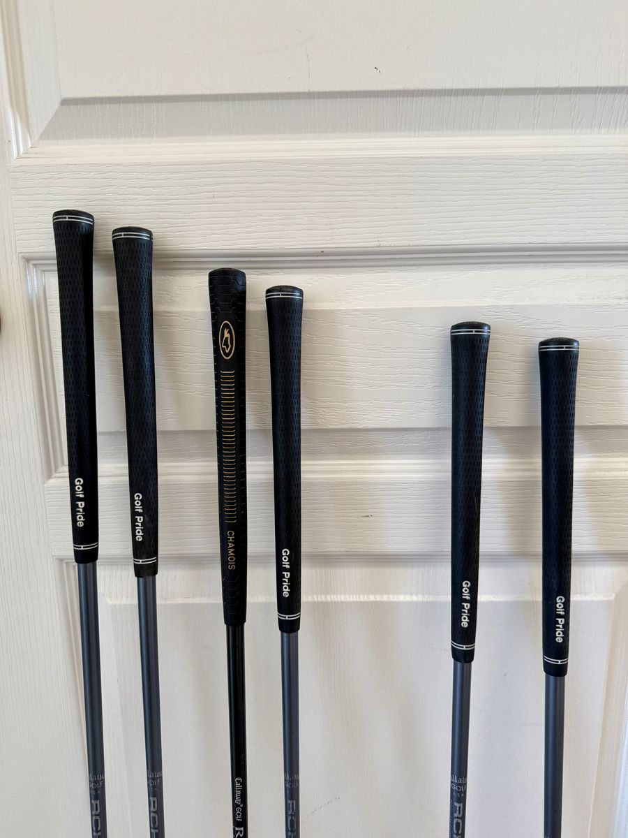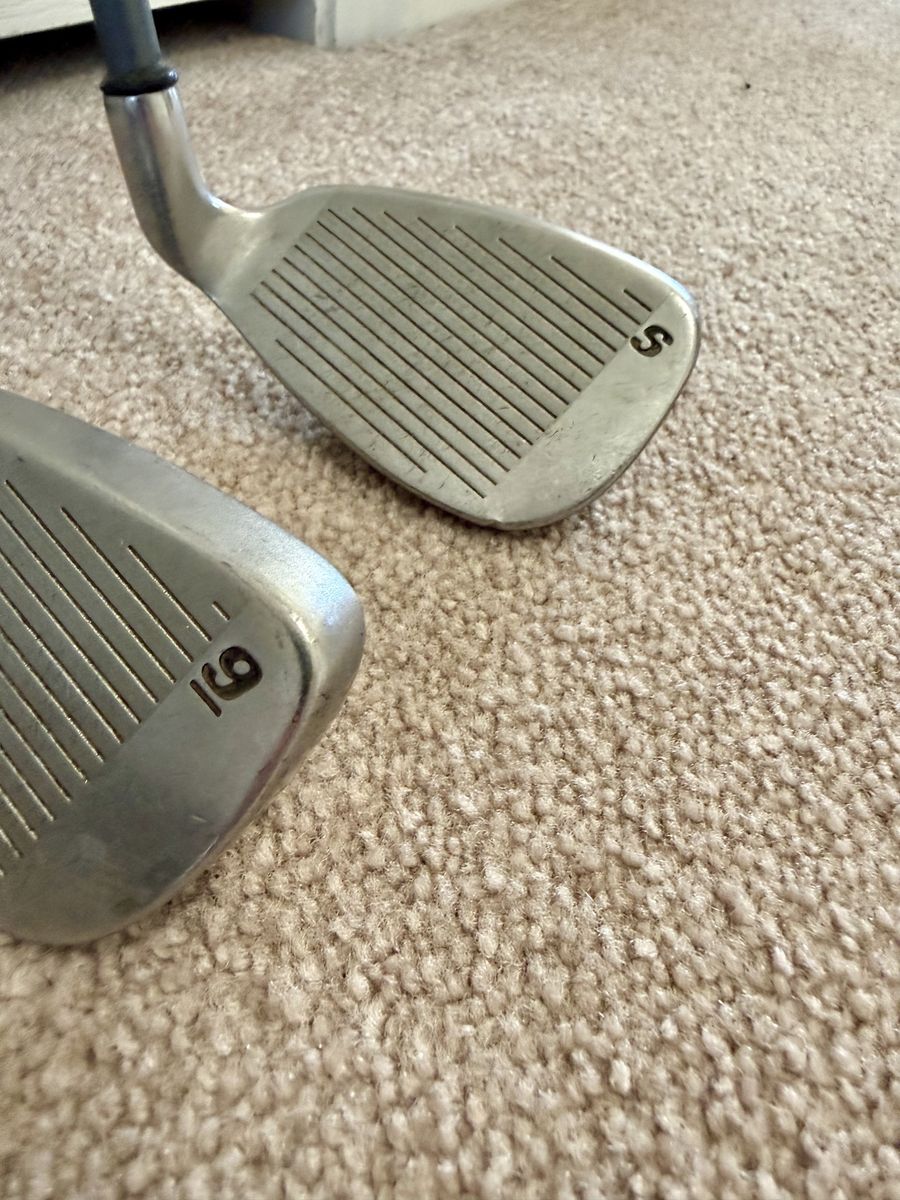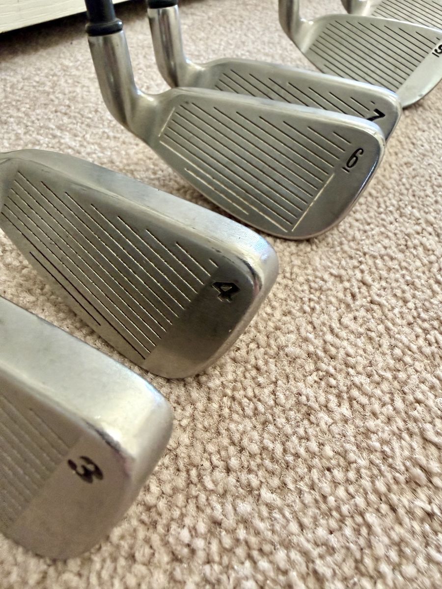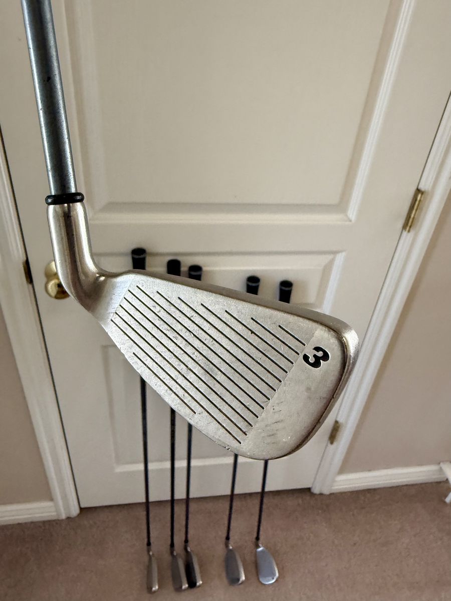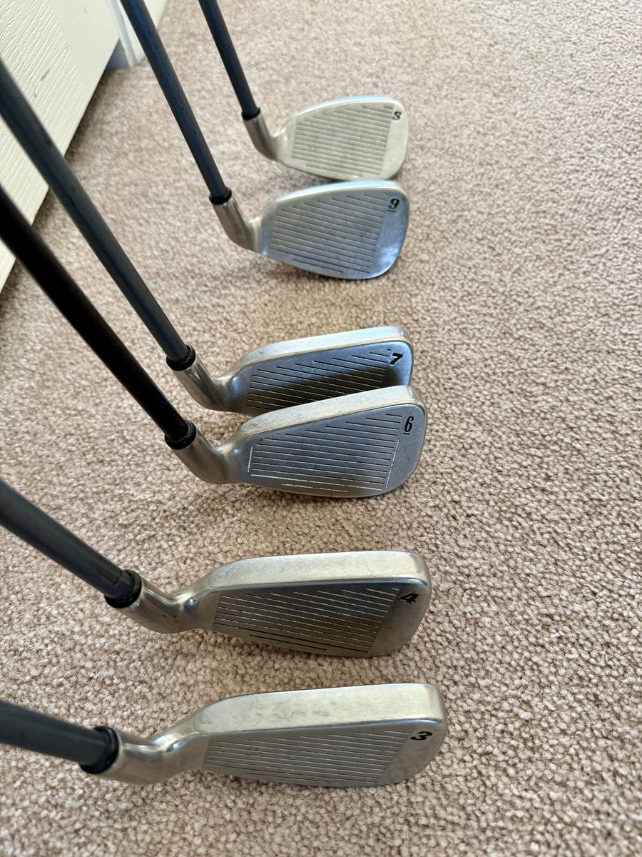 Comes with 3,4,6,7,9 and Sand wedge. All have firm flex except the 6 iron, which has regular flex. Grips are all good. $130.