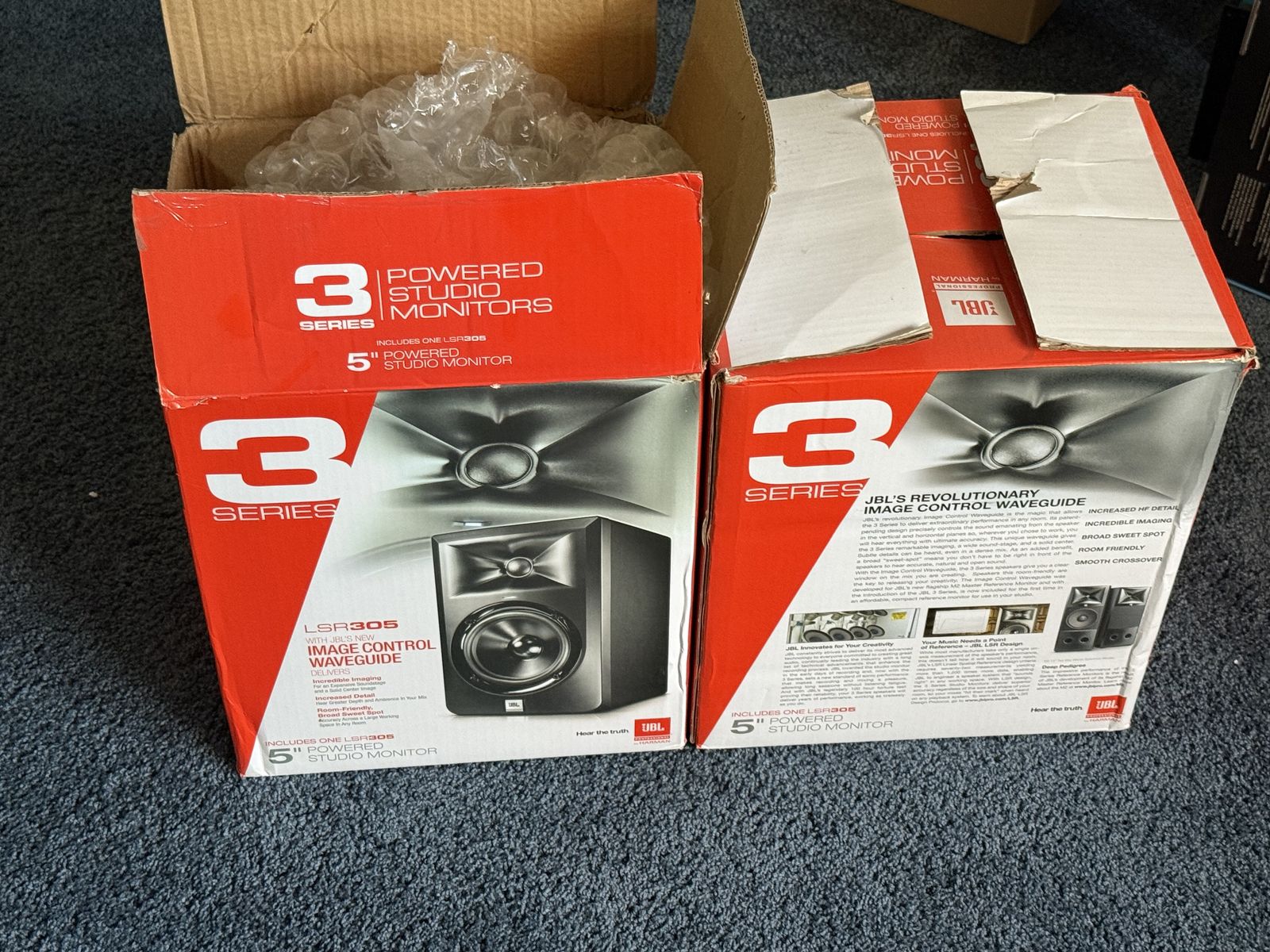 VenmoSolid 5 powered studio monitors — these are the ones with JBL's Image Control Waveguide from their flagship reference monitors. Wide stereo image, tight bass down to 43Hz, and 82W of Class-D power per pair. Balanced XLR and TRS inputs, trim controls for dialing in your room.