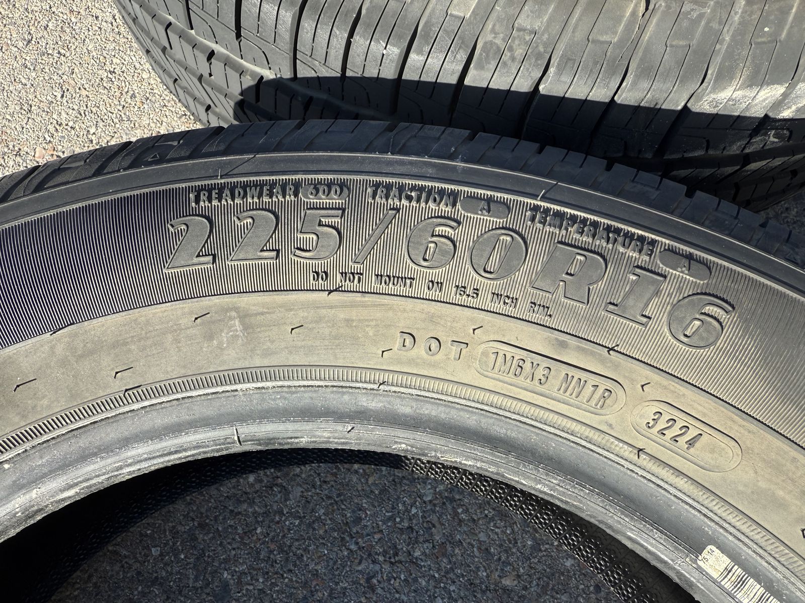 Full set of Goodyear Reliant tires in 225/60R16. All tires were made in 2024. The tread depth is 8/32nds for all of them (see photos). The tire ratings are treadwear is 600, traction is A, and temperature is A.