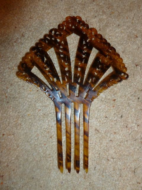VenmoThis is a very Large and very old hair comb. It is 6 1/2 tall x 4 1/2 wide. It is in pristine condition. The comb is a celluloid tortoise shell color. With beautiful browns and carmel's. The comb has alot of the tortoise striping in it. The rhinestones are a very pretty lime green. The filigree design is delicate and detailed. I believe this is from the late 1800's to the early 1900's. Most of the larger combs are not around anymore. So a large comb in this condition is very hard to find. Pictures show the front and back of the comb. This is from a private collection. Price is firm.