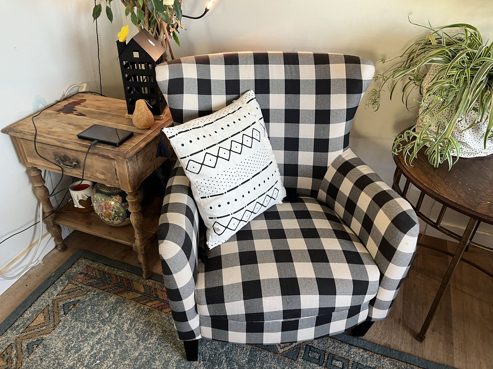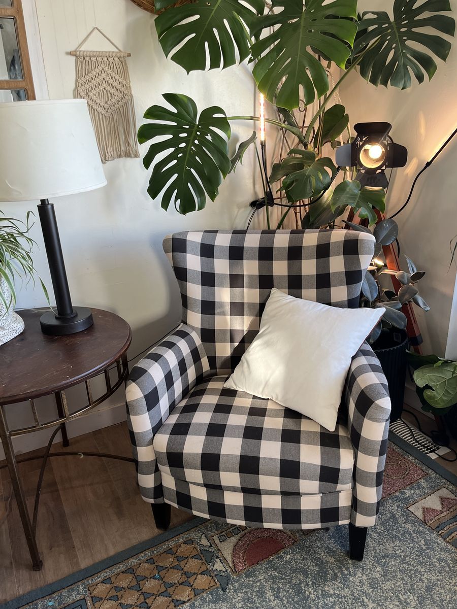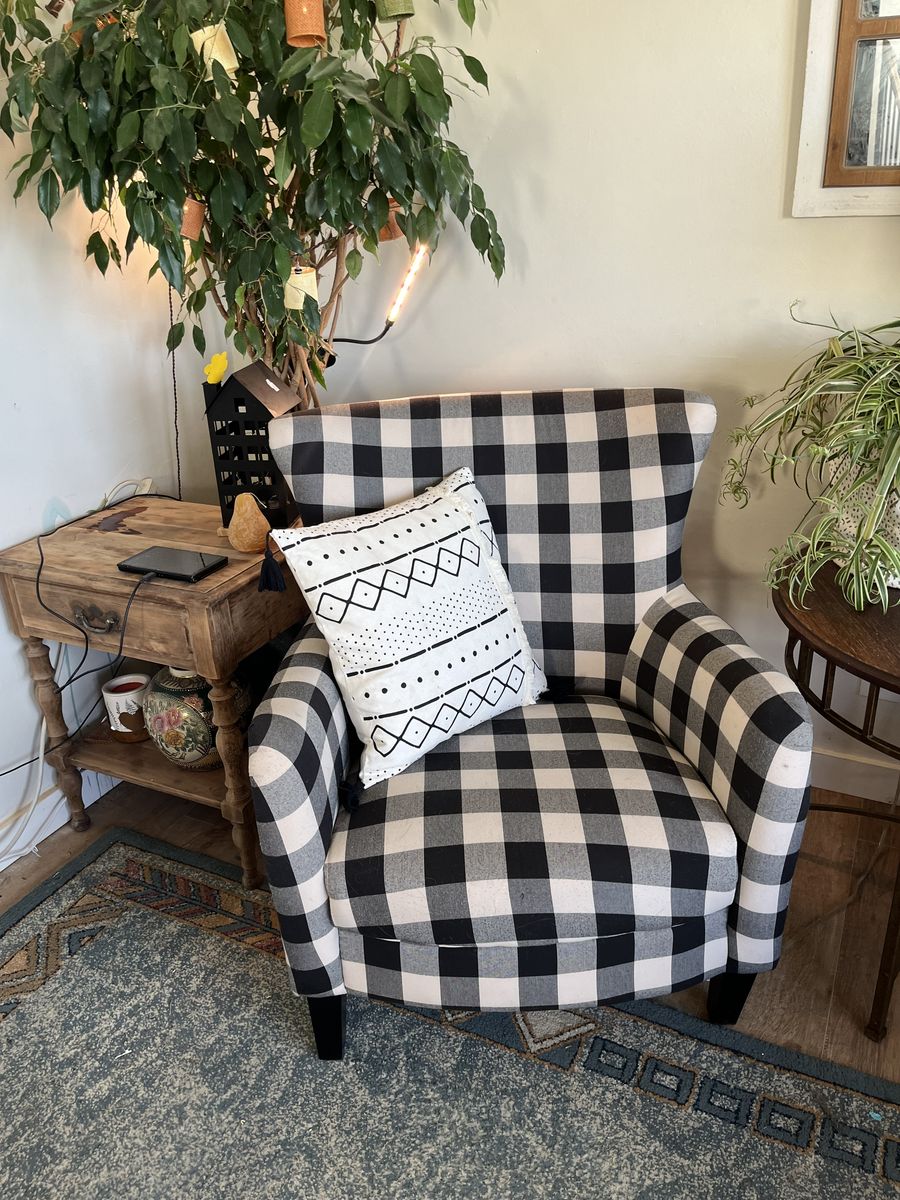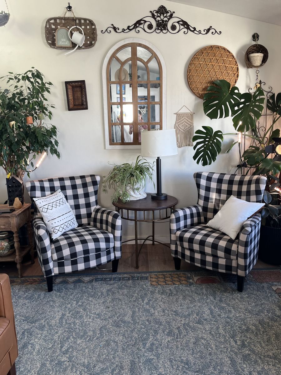 Upholstered wing back farm chair made for Noble house home furnishings in 2018 really great condition set of two for $250 local pick up!