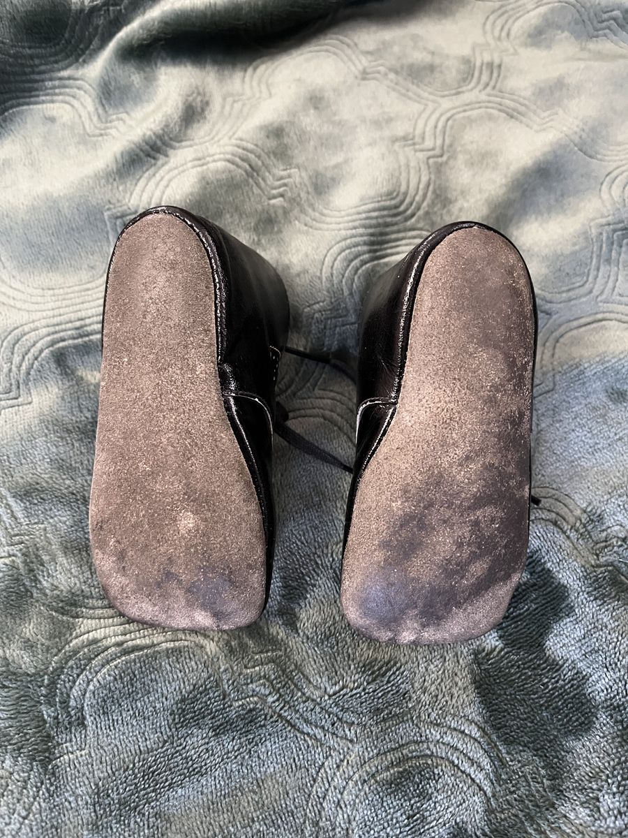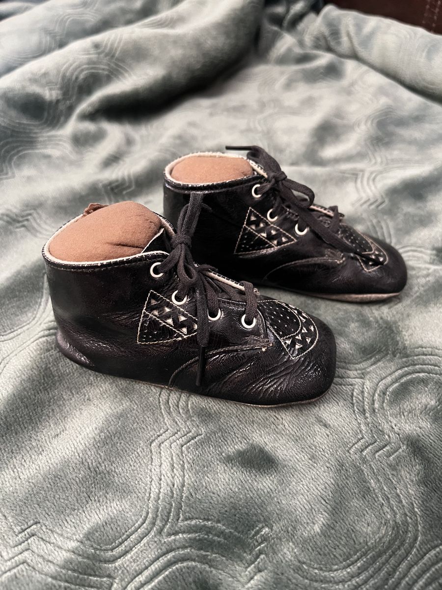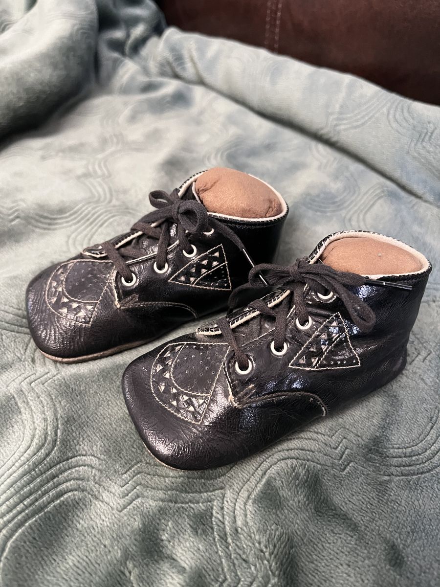 VenmoThis is a darling pair of baby shoes. The shoes are black with cutouts showing a white underneath. The bottoms look like they might have been worn. The shoes are in very good condition. They measure 4 1/2 inches long. The widest part of the shoe is 2 inches across. A really fun item for display, like on a doll. Selling for a parent. Price is firm.