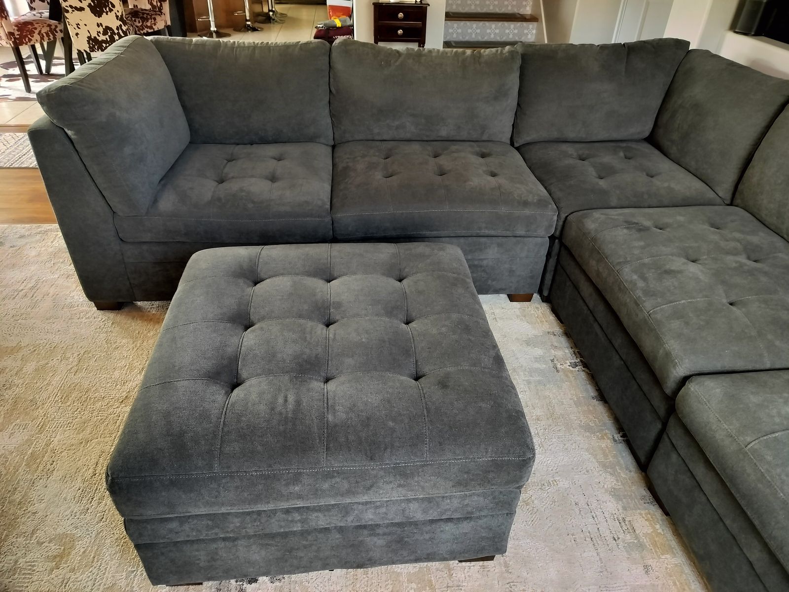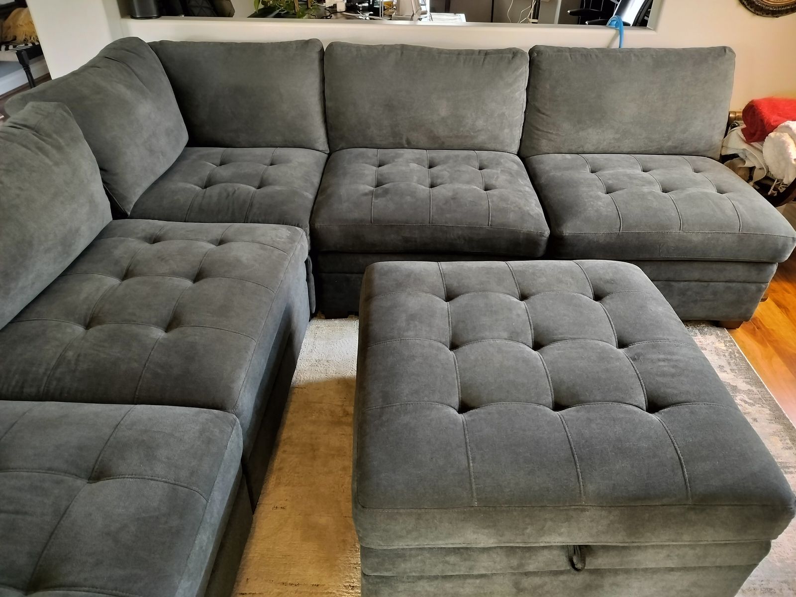 VenmoNewer grey fabric sectional sofa. Bought last year. Ottoman opens and offers large storage. Connects together or comes apart in 3 sepereate pieces so you can design it how you would like. Newly cleaned and in great condition. Message with questions.