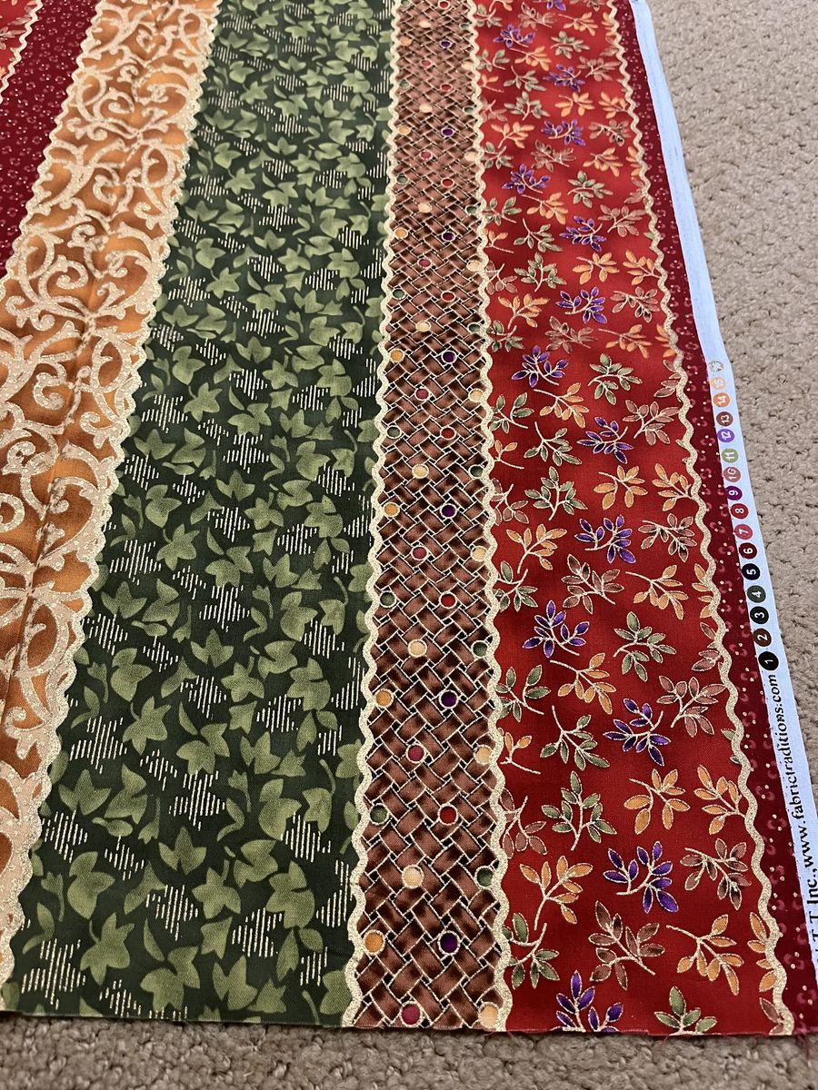 VenmoThis has golds, greens, browns, rust and even purple in the dots and leaves. There is a glitter look in the material which adds richness to it. This one piece is 2 yards and 10 inches long. The colors are darker and brighter than shown in the pictures. Must see! Price is firm.