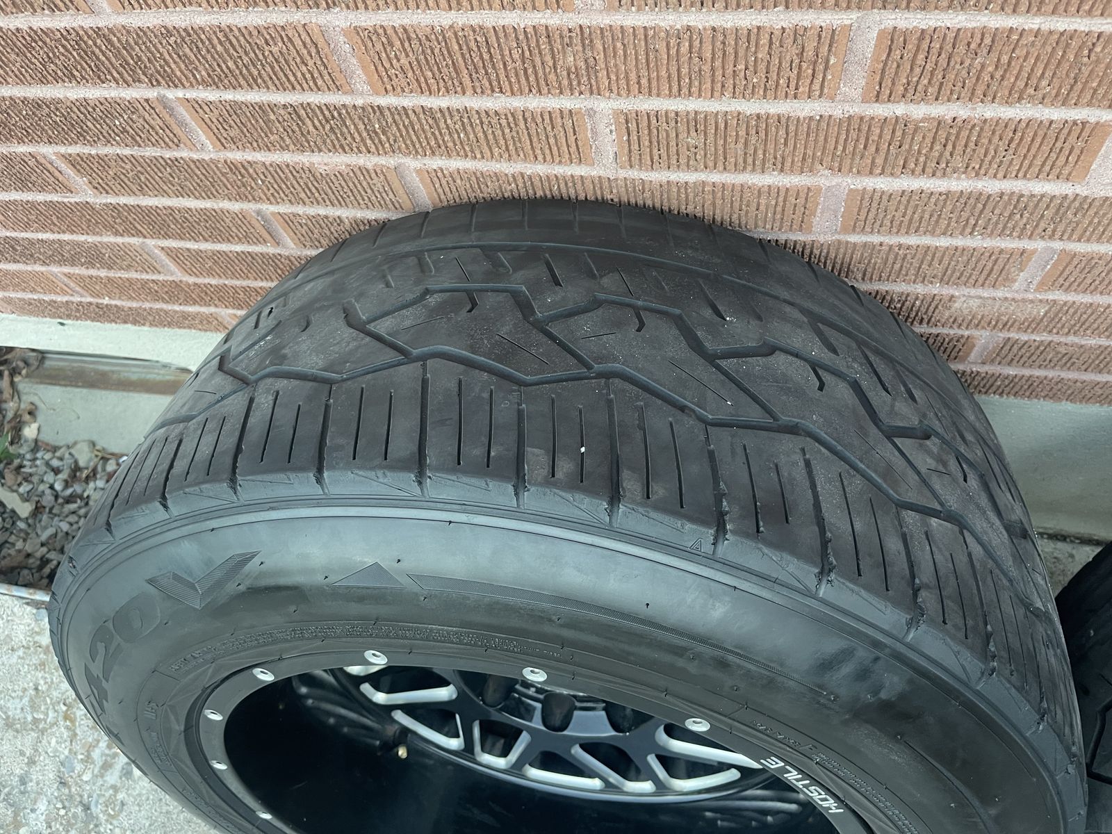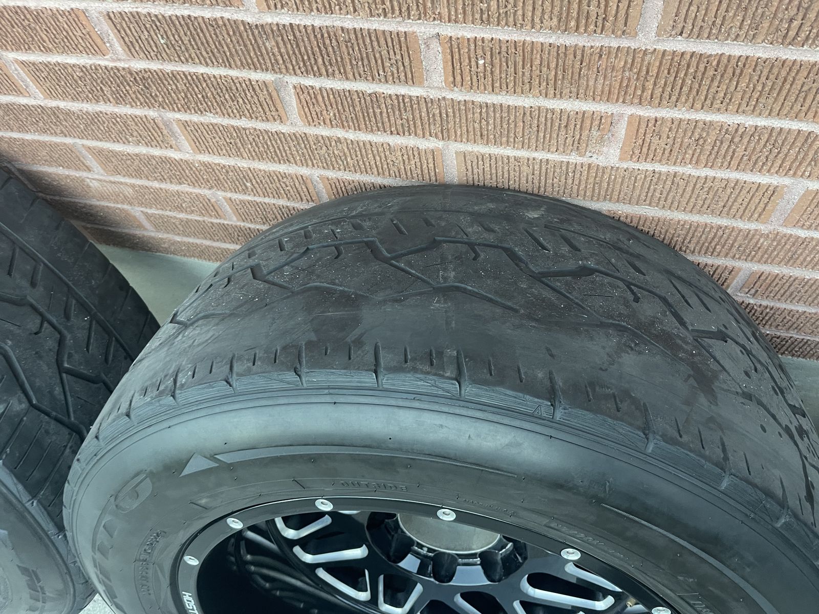 tires are pretty much bald, but you could still run them. The rims are pretty good condition. Very little curb rash on one