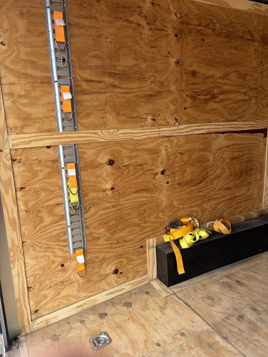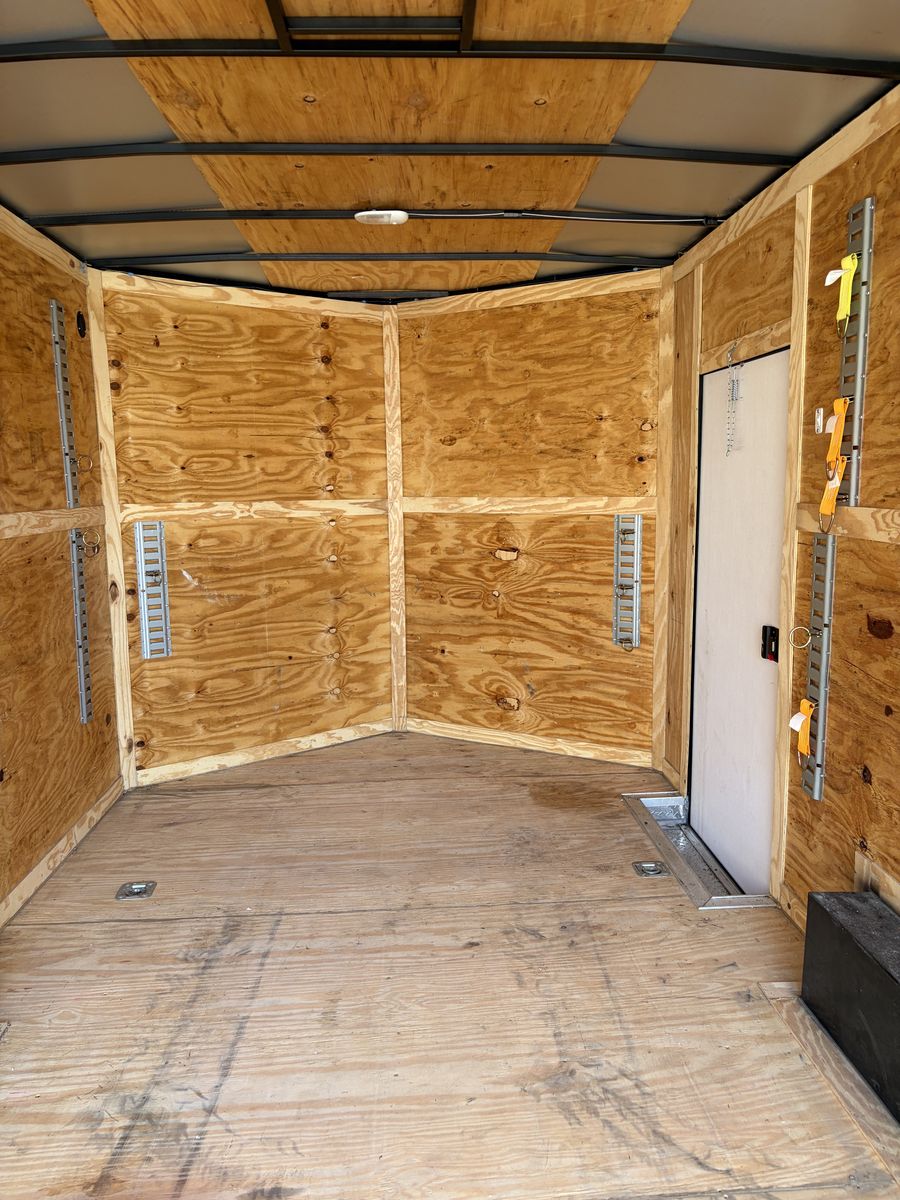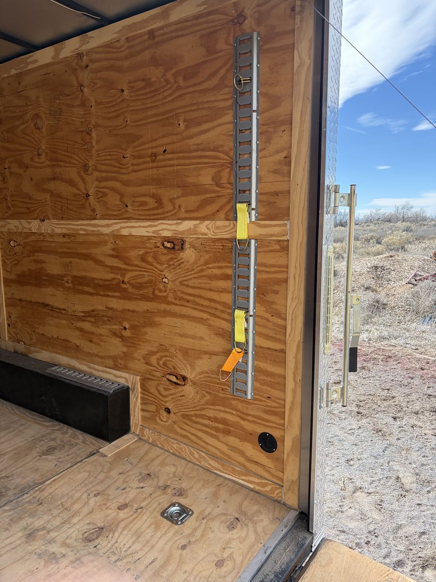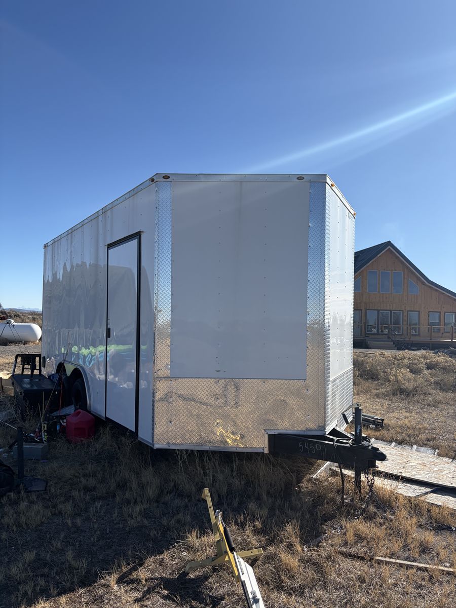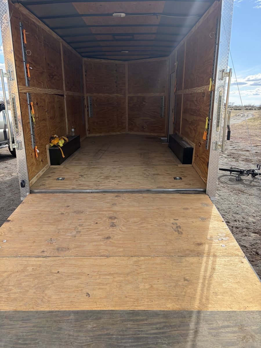 From inside the point it’s 18’ long and door opening is 7’6” wide and 7’ 2” tall. Inside dimension of wheel wells is 83 1/2”. Feel free with any serious questions. Anyone asking “ is this still available”? Will receive a sarcastic response. No trades are needed.
