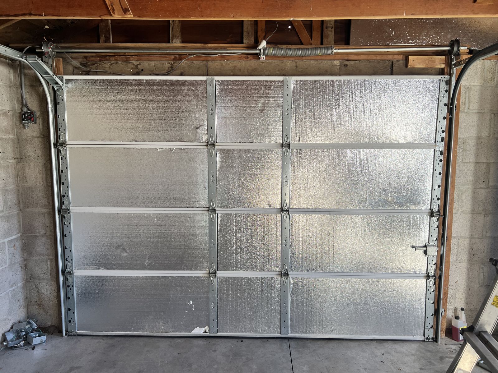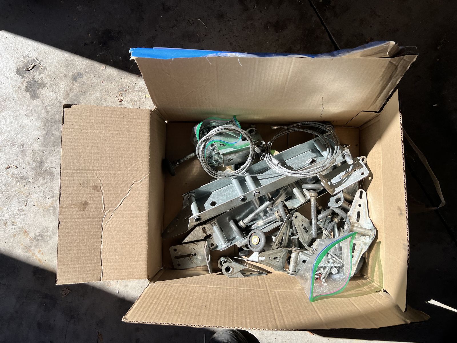 ZelleGarage door and hardware. torsion bar, torsion spring, pulleys and cables. Also the top rails for rollers. No vertical rails (cemented in).