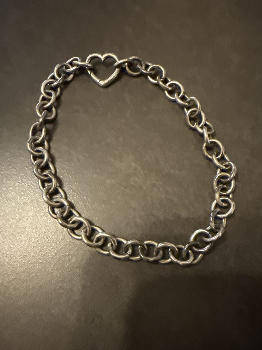 VenmoReal silver. The heart is the clasp. It measures 16 1/2 inches long.