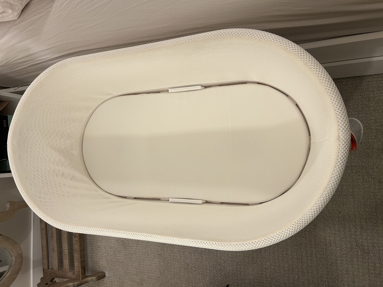 We have loved this bassinet! We just moved our baby into a crib and don’t have the storage space for this! It was purchased secondhand, but has been hardly used. Our baby slept well through the night, so we only used it for the first two months, then just used it as a regular bassinet. It comes with two size small sleep sacks, a snoo mattress cover (white) and leg lifts. The snoo functions great, no grinding or whining noises. We inspected it for any O-rings that may have worn down when we got it, but everything looked great! It can be connected and controlled via an app on your phone, or you can use the button located at the front. I took a video of each level of soothing it cycles through (4 in total) but could only get the first three in due to recording limitations but they all work great! Comes from a smoke free home (we do have pets, but they don’t reside in our bedroom) if you have any questions, please reach out! Cash or Venmo only please! Pick up in American Form