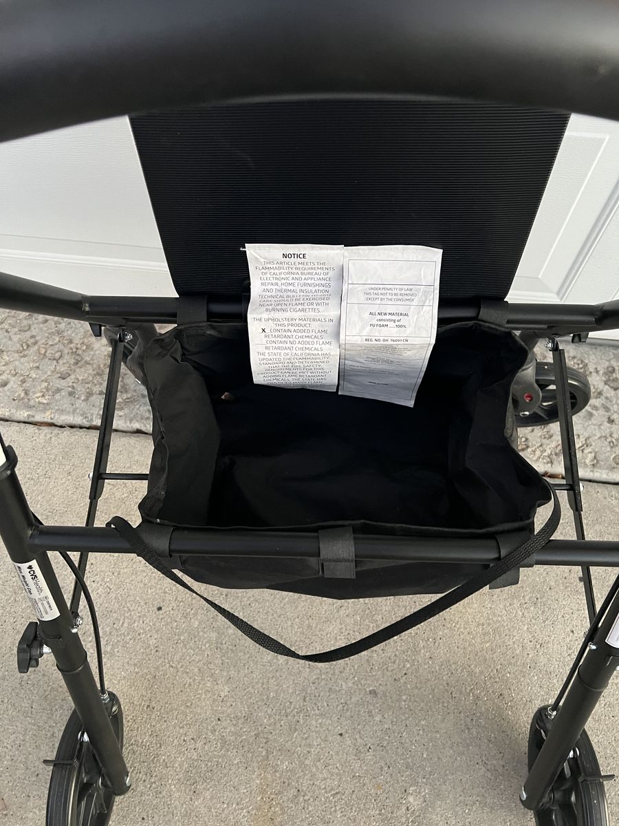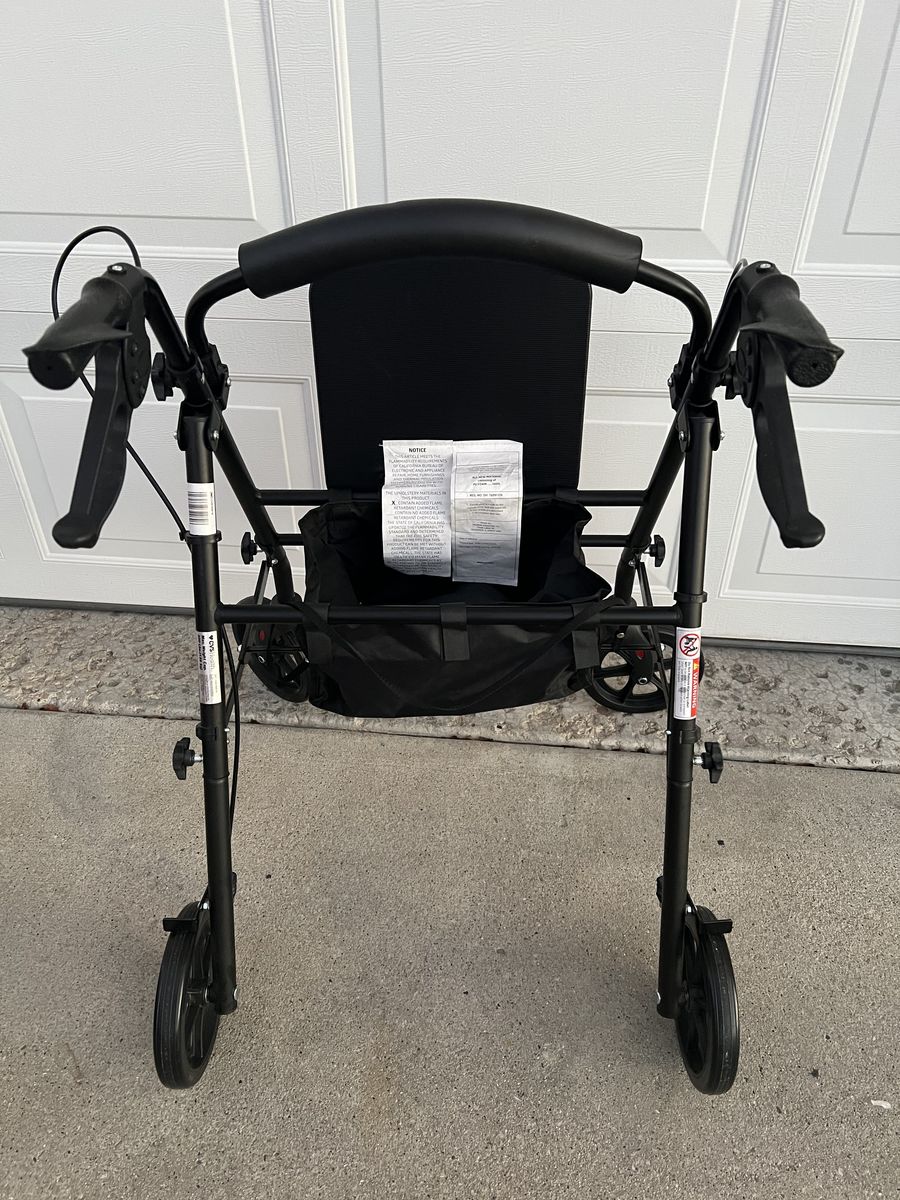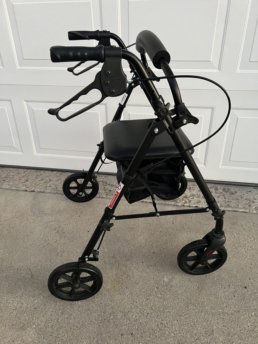 This walker is practically new. We purchased it for a family member that only used it 1-2 times. Has a nice storage compartment, big wheels, breaks, and a chair to sit on