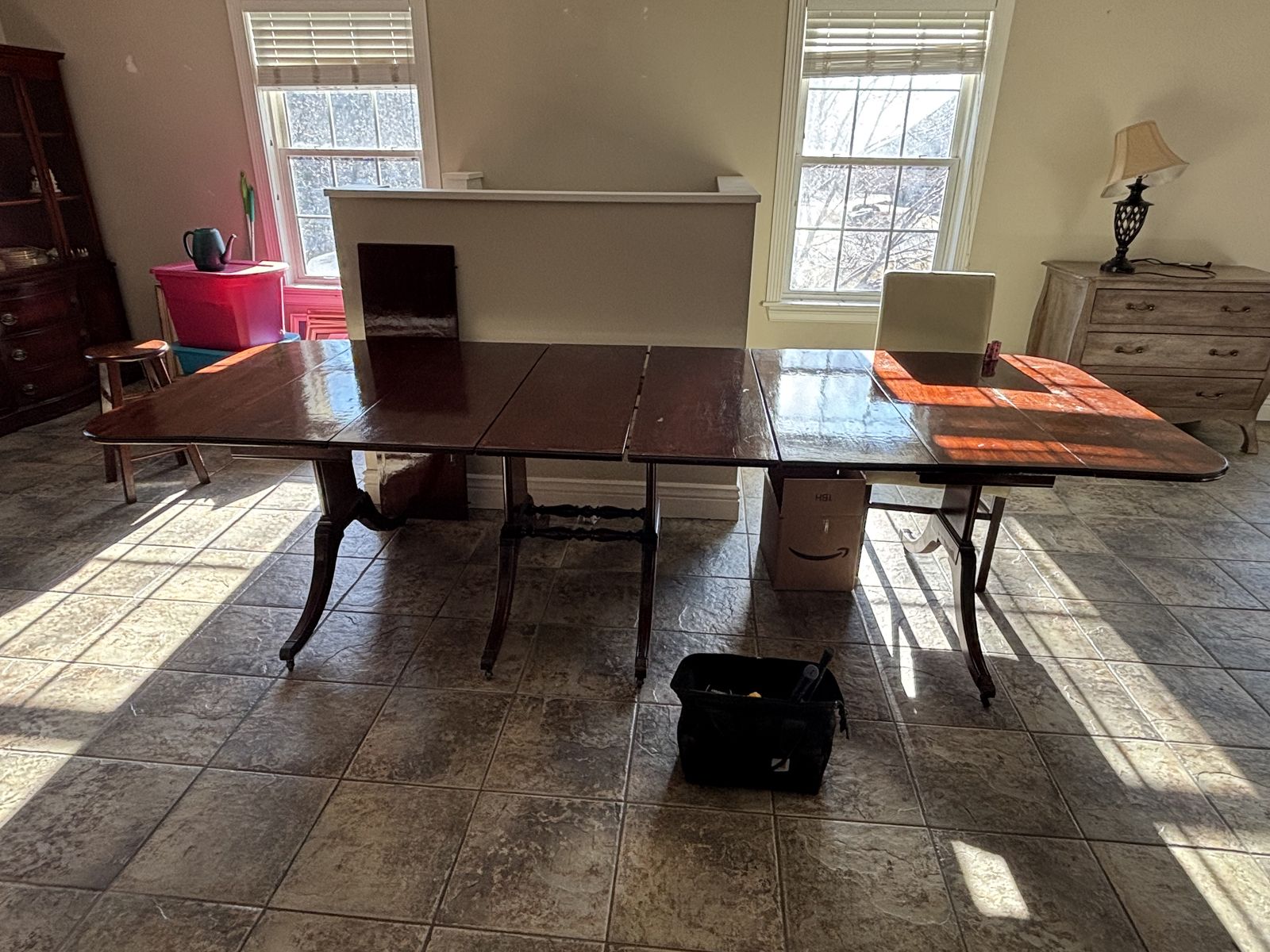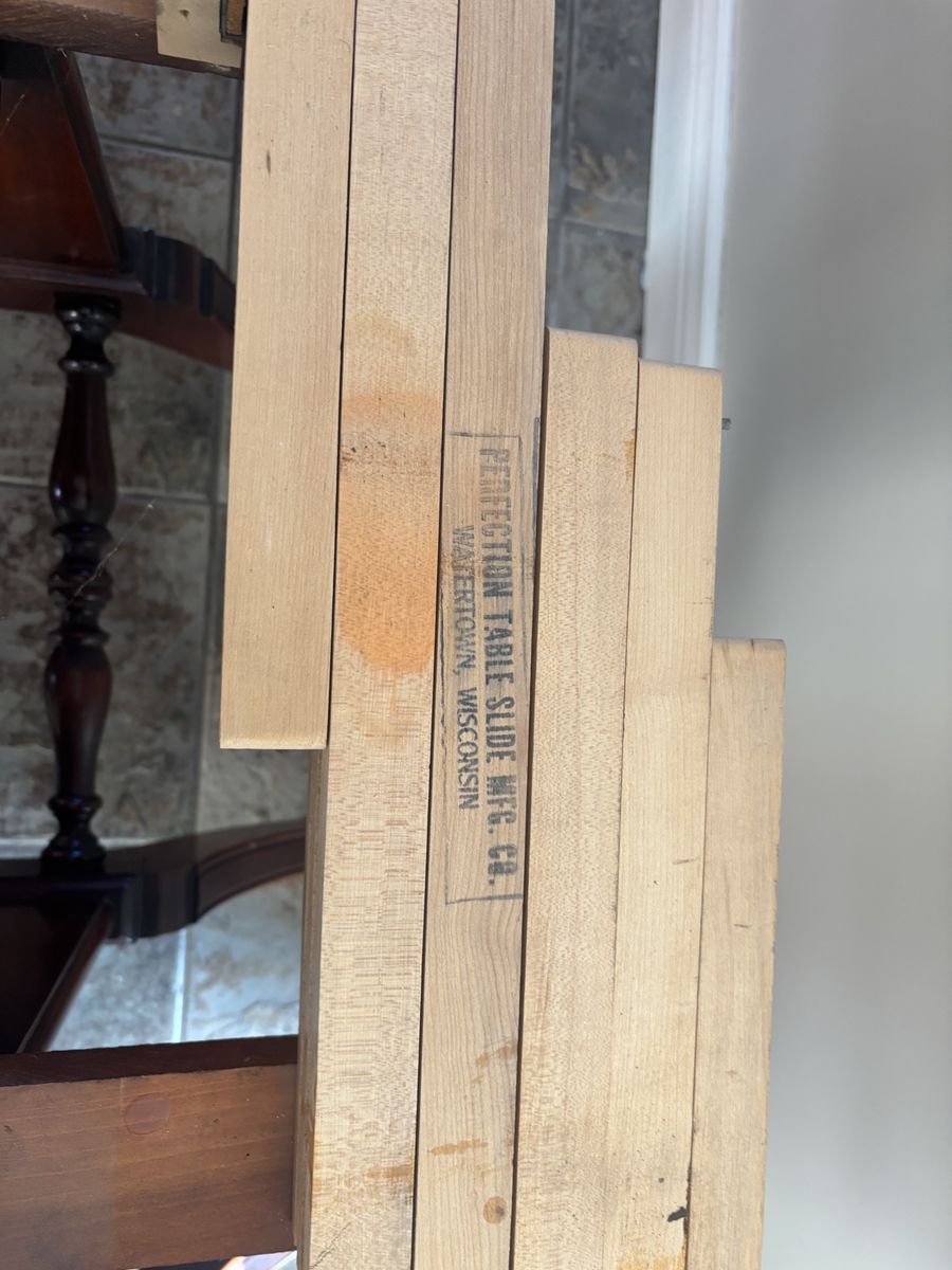 Table 10’7” long with all leaves in. 3’6” wide Tall 2’5” 5 leaves in total Table with all leaves out 4’8” long And 3’6” wide