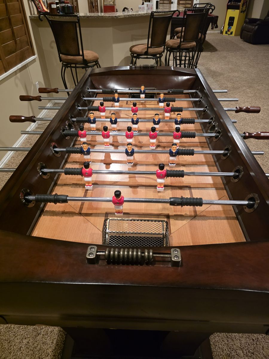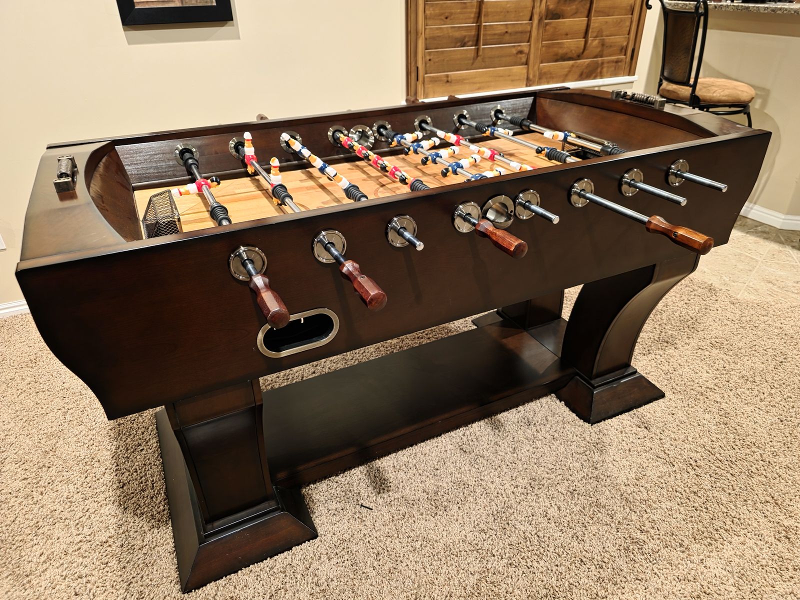 Features: - Competitive-size foosball table with 46.75" x 26.75" playfield