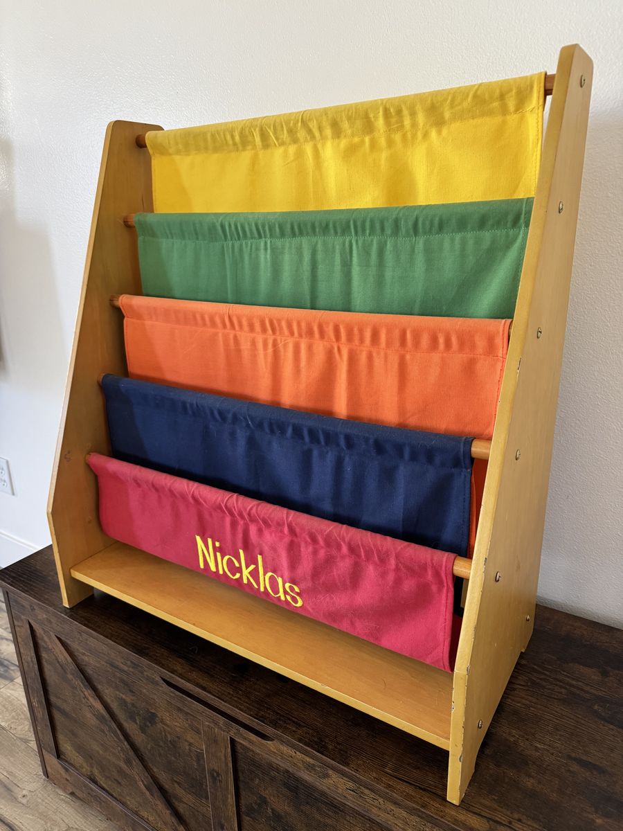 I have this fabric book shelf for sale! It has been used and has the name Nicklas embroidered into it. It works great and comes from a pet friendly home. Dimensions are in the photos