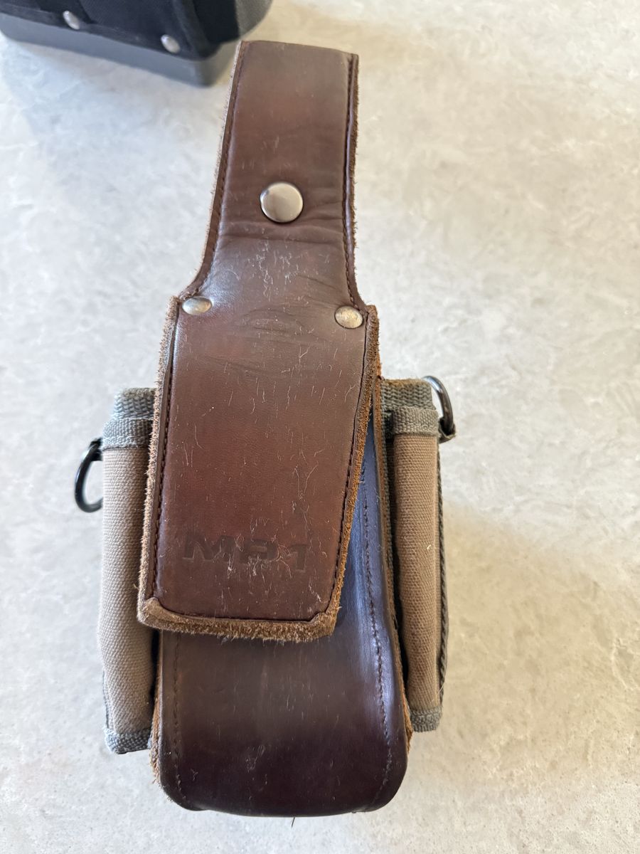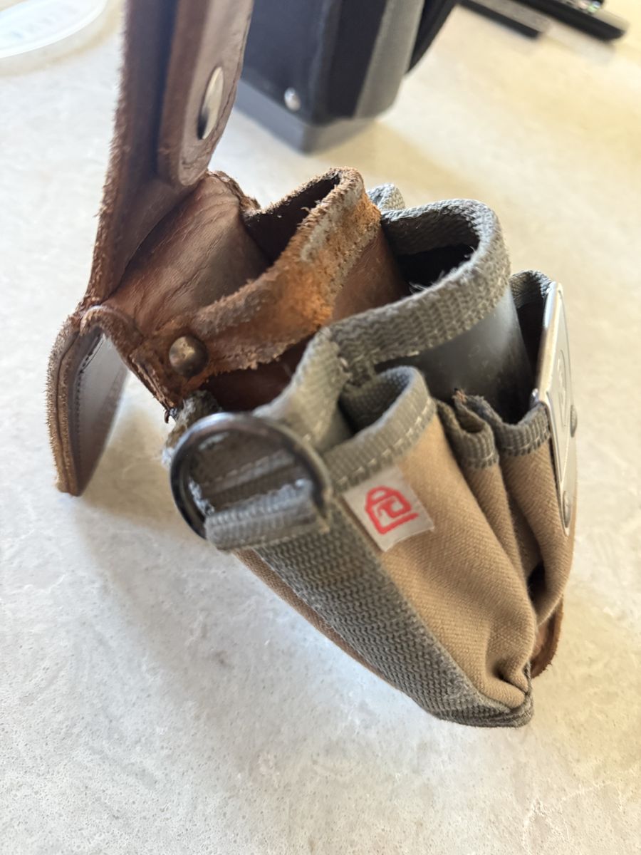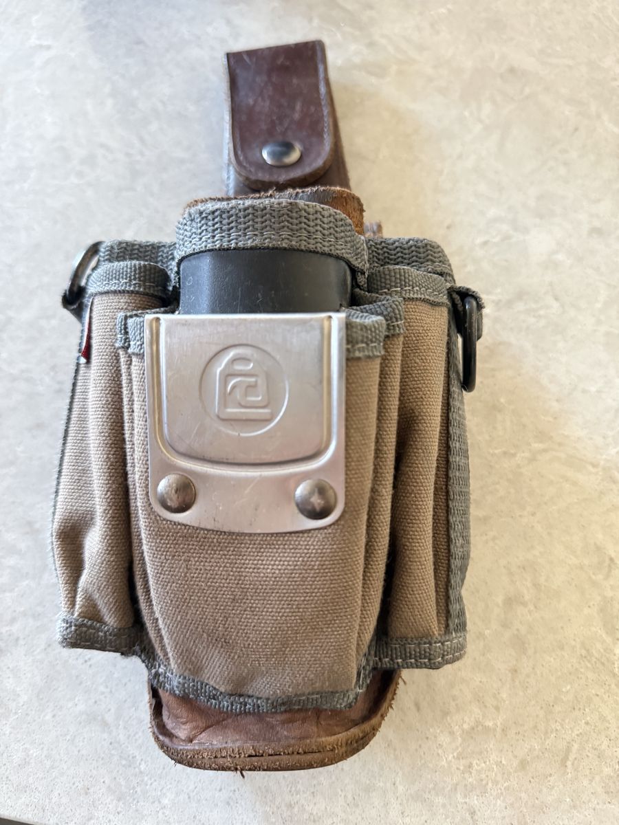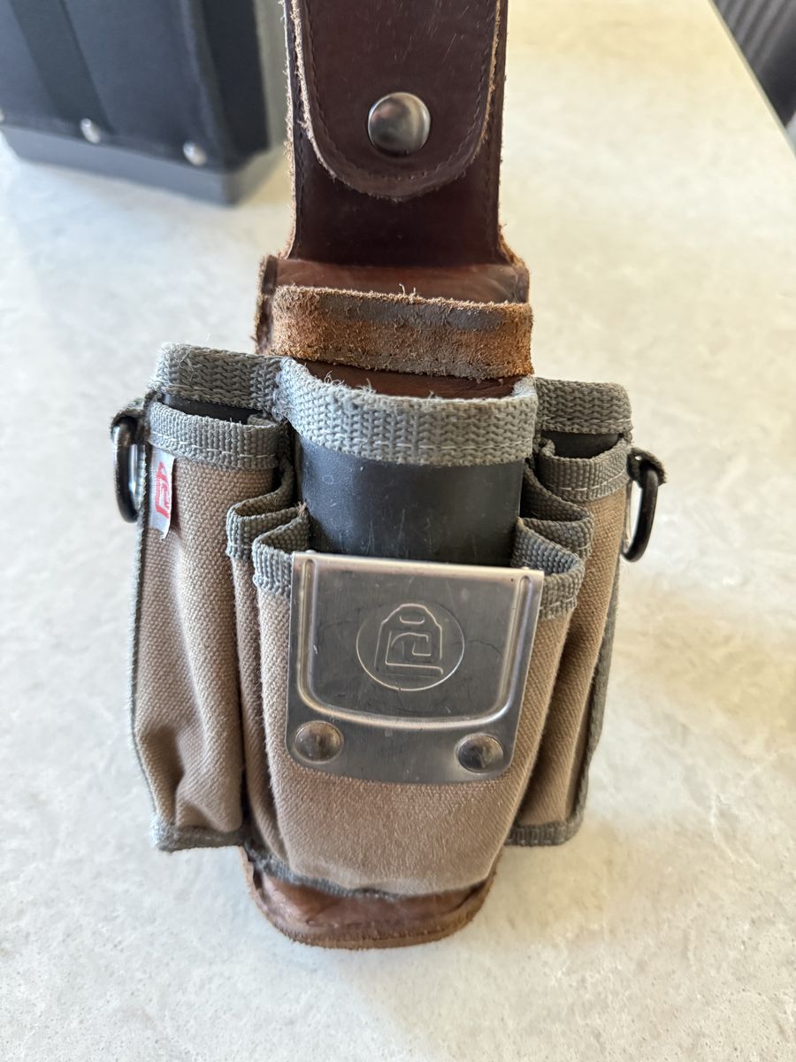 Handy tool pouch has a sturdy leather belt loop and canvas pockets. Great for keeping tools organized. Has a metal clip on front too.