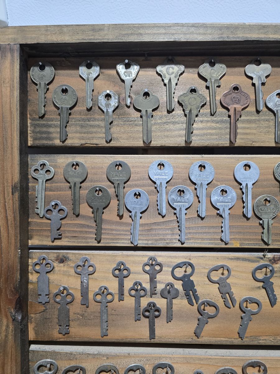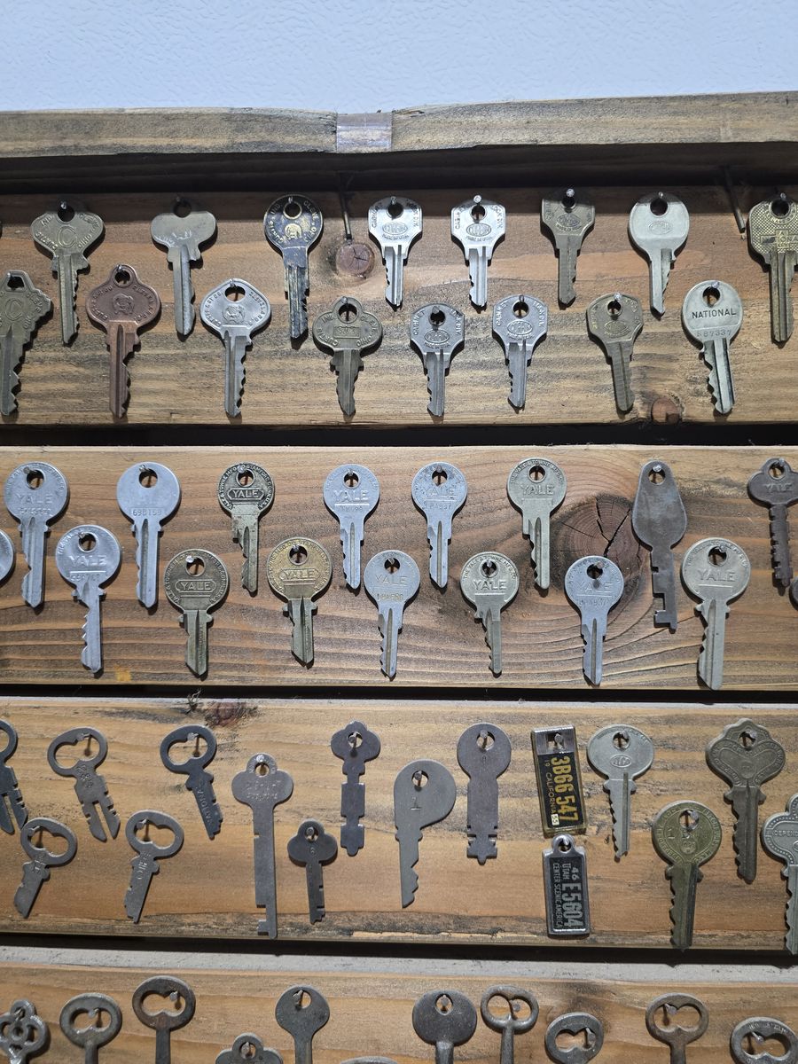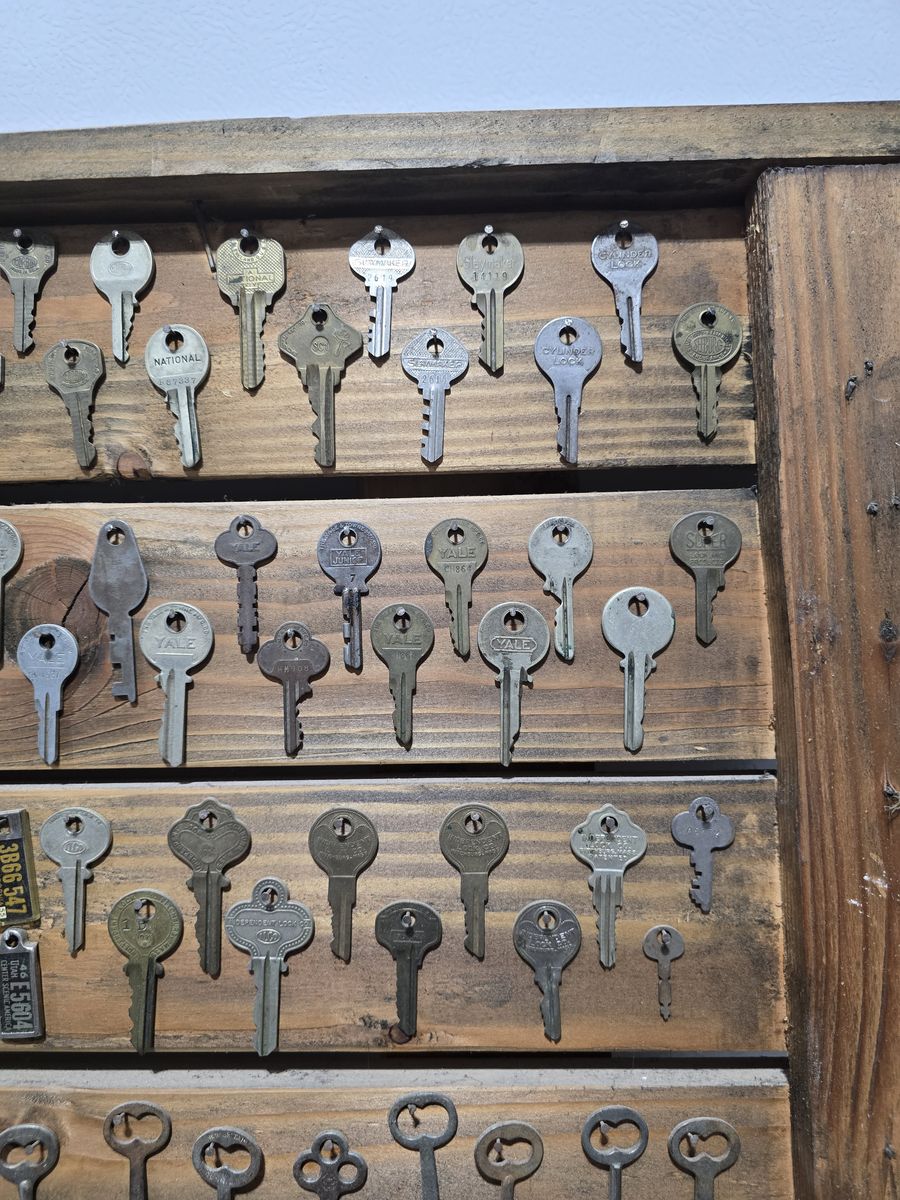 VenmoGreat key collection. Over two hundred keys as well as a couple miscellaneous items. All hung/framed on a stained, wood, rustic 31 x 32 pallet. Call, text or email what's any questions.