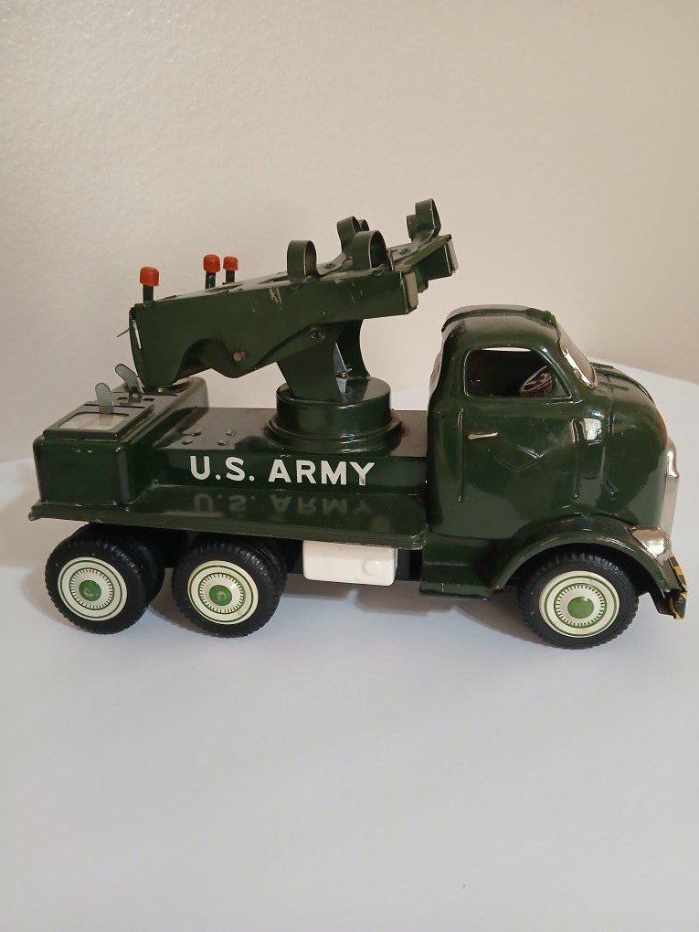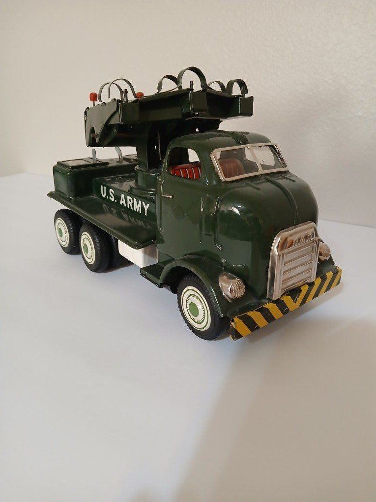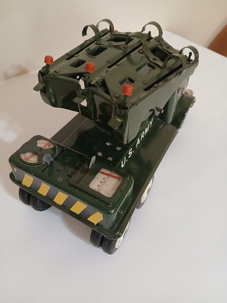 VenmoRare 1950's Yonezawa Japan U.S. Army rocket missile launcher GMC truck tin friction in great condition! (it is missing the rockets) springs work, range works. yes it is available. no scam/spam texts.