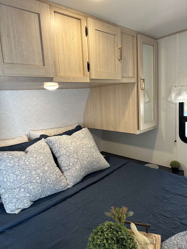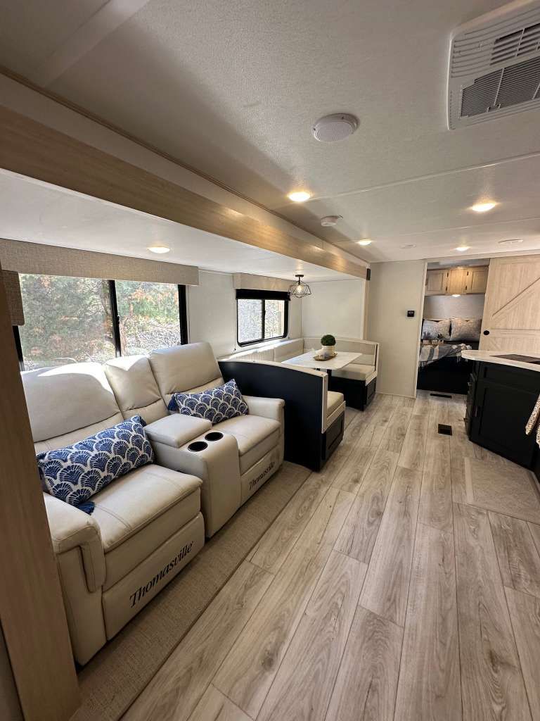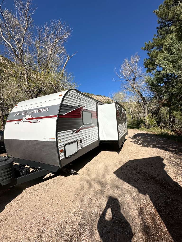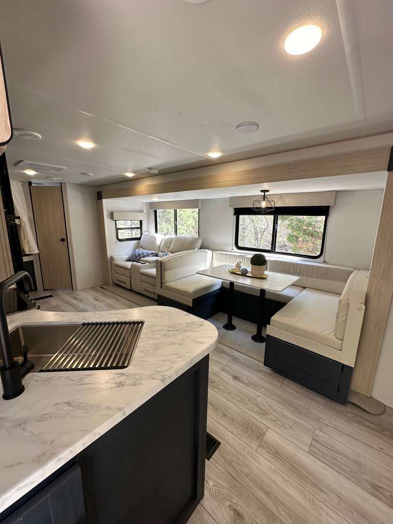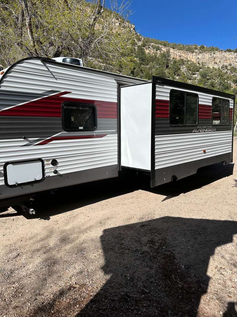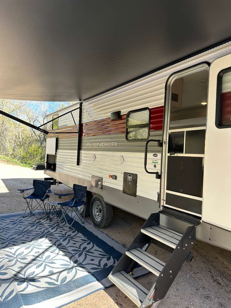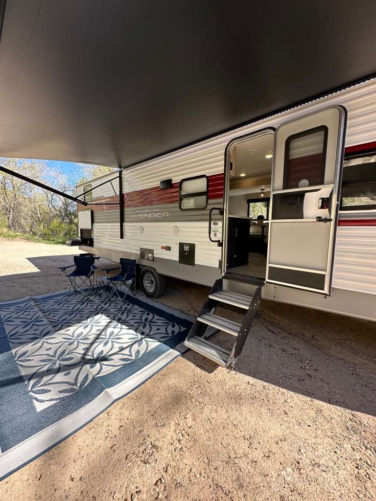 The 2024 Avenger 27DBS is the ultimate choice for family road trips or gatherings with friends. It can sleep up to 6 people comfortably as the dining table doubles as a queen. Stretch out in the spacious layout featuring a sizable slideout, ensuring everyone has their space. The 42-gallon fresh water tank means you can extend your trips without worrying about refills, making it an excellent option for boondocking in the great outdoors. Having double the Air Conditioning units makes even the hottest days cool. Plus, the cozy wood construction adds warmth to your camping experience. There is plenty of starage space for you to pack for all your camping needs. With a 16-foot awning, you’re all set for shaded afternoons in nature.