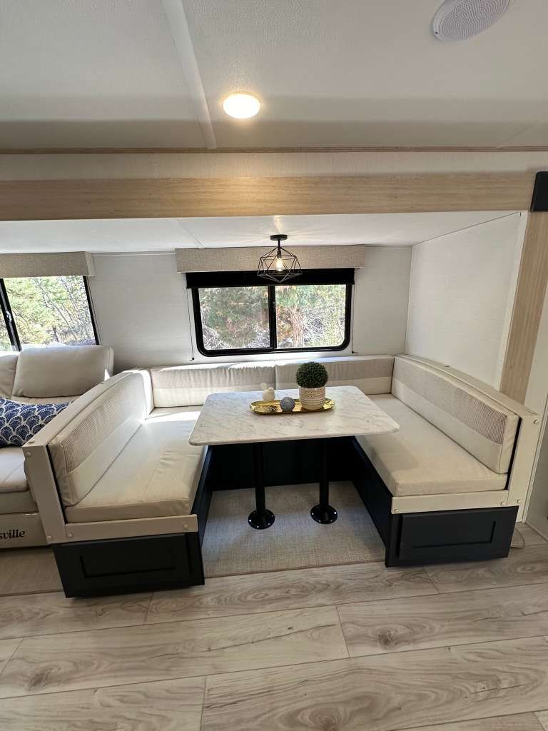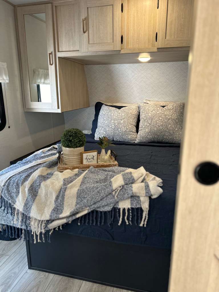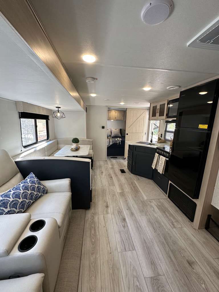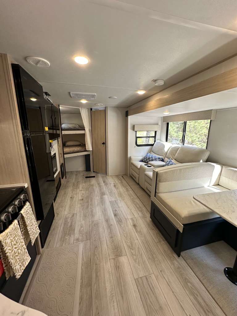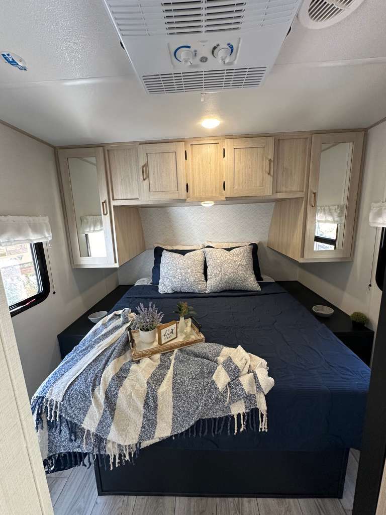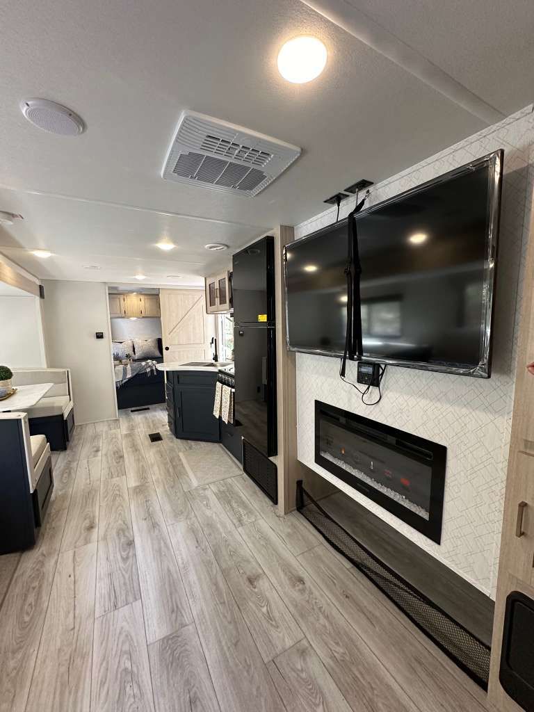 The 2024 Avenger 27DBS is the ultimate choice for family road trips or gatherings with friends. It can sleep up to 6 people comfortably as the dining table doubles as a queen. Stretch out in the spacious layout featuring a sizable slideout, ensuring everyone has their space. The 42-gallon fresh water tank means you can extend your trips without worrying about refills, making it an excellent option for boondocking in the great outdoors. Having double the Air Conditioning units makes even the hottest days cool. Plus, the cozy wood construction adds warmth to your camping experience. There is plenty of starage space for you to pack for all your camping needs. With a 16-foot awning, you’re all set for shaded afternoons in nature.