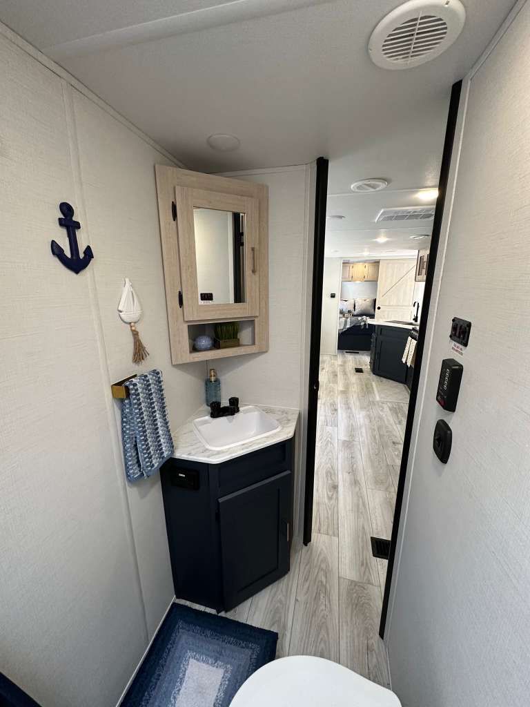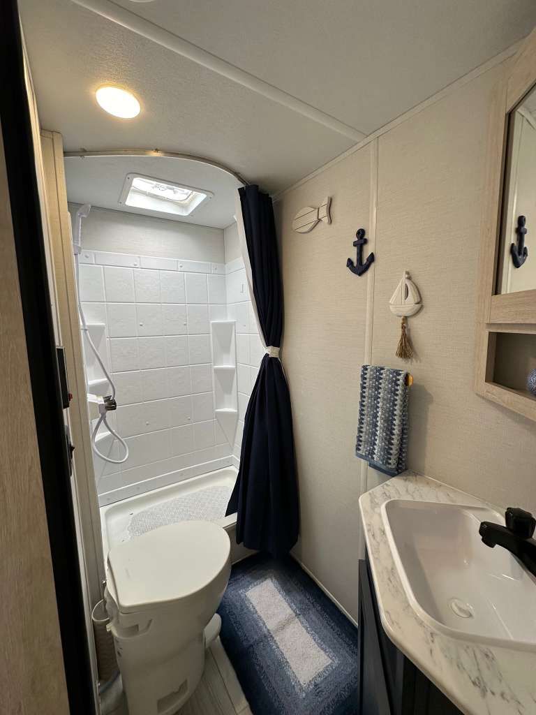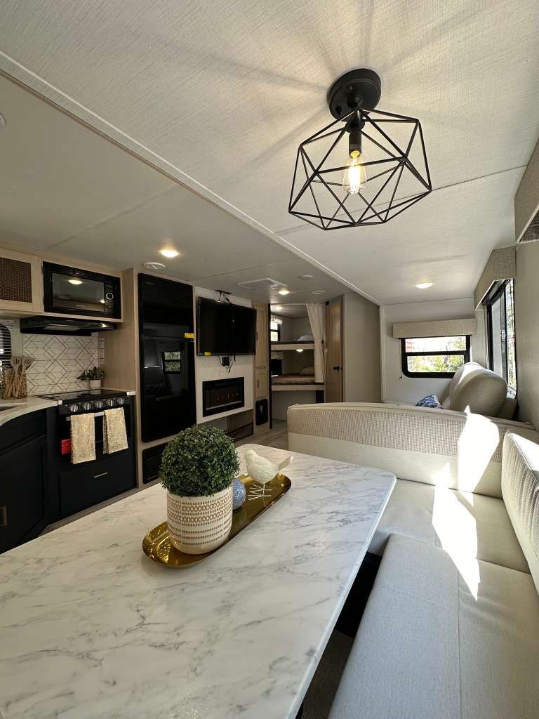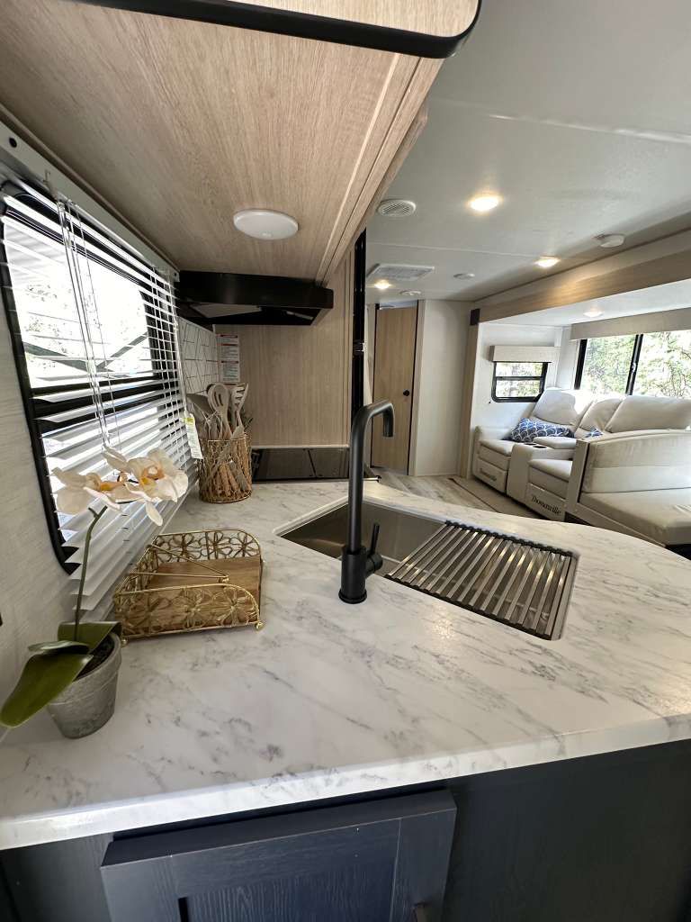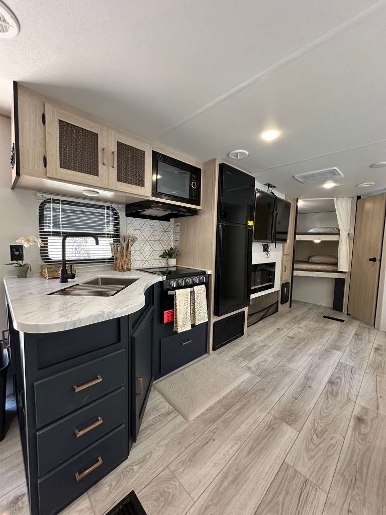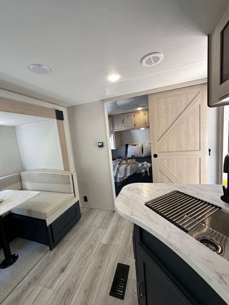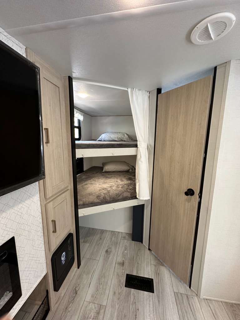 The 2024 Avenger 27DBS is the ultimate choice for family road trips or gatherings with friends. It can sleep up to 6 people comfortably as the dining table doubles as a queen. Stretch out in the spacious layout featuring a sizable slideout, ensuring everyone has their space. The 42-gallon fresh water tank means you can extend your trips without worrying about refills, making it an excellent option for boondocking in the great outdoors. Having double the Air Conditioning units makes even the hottest days cool. Plus, the cozy wood construction adds warmth to your camping experience. There is plenty of starage space for you to pack for all your camping needs. With a 16-foot awning, you’re all set for shaded afternoons in nature.