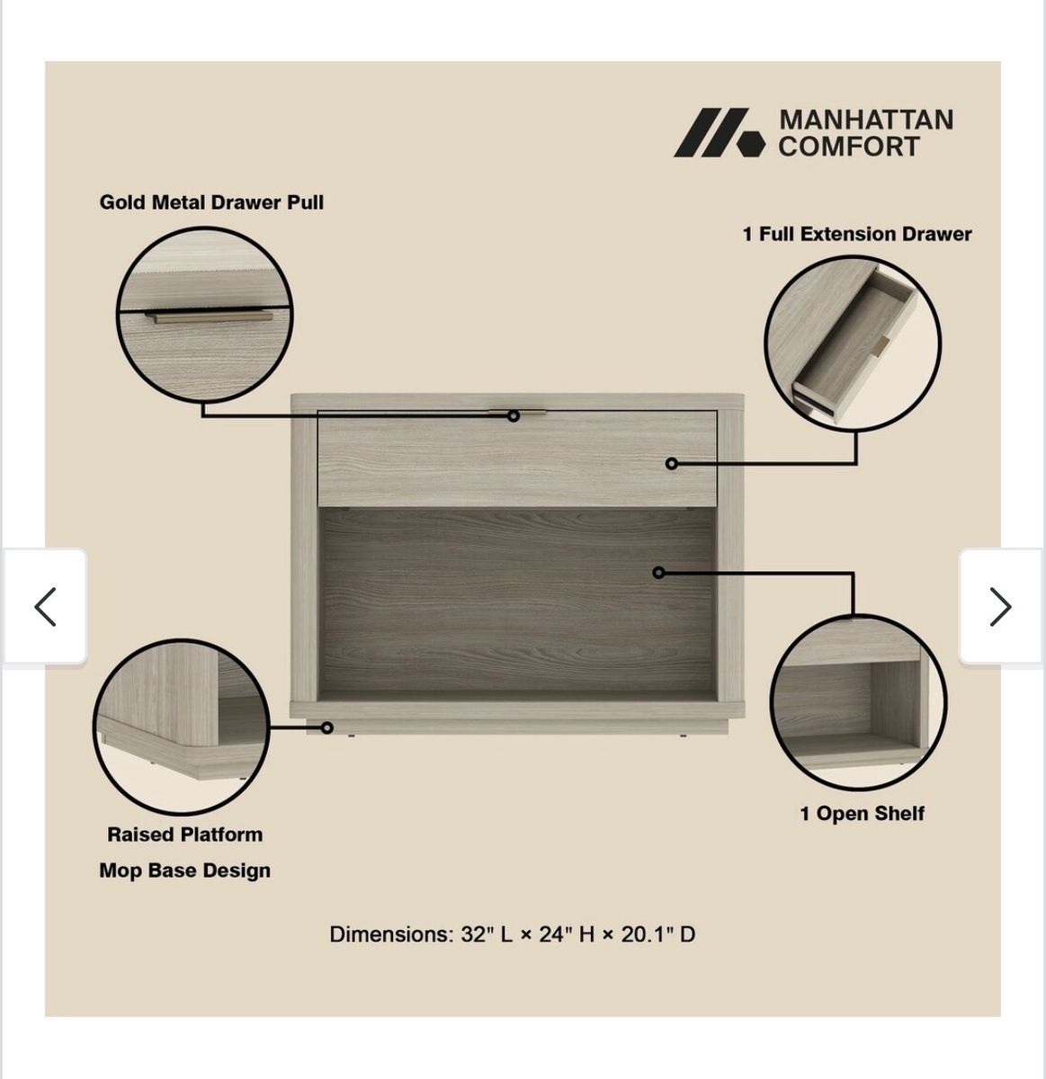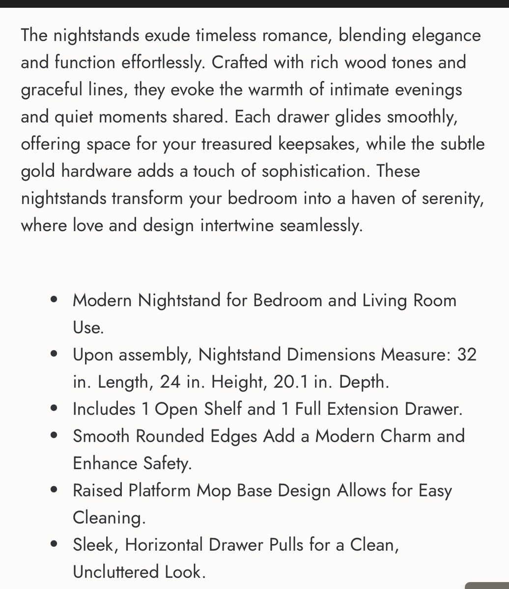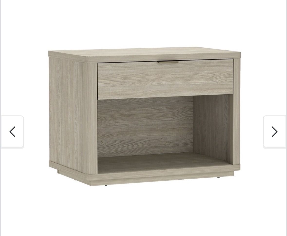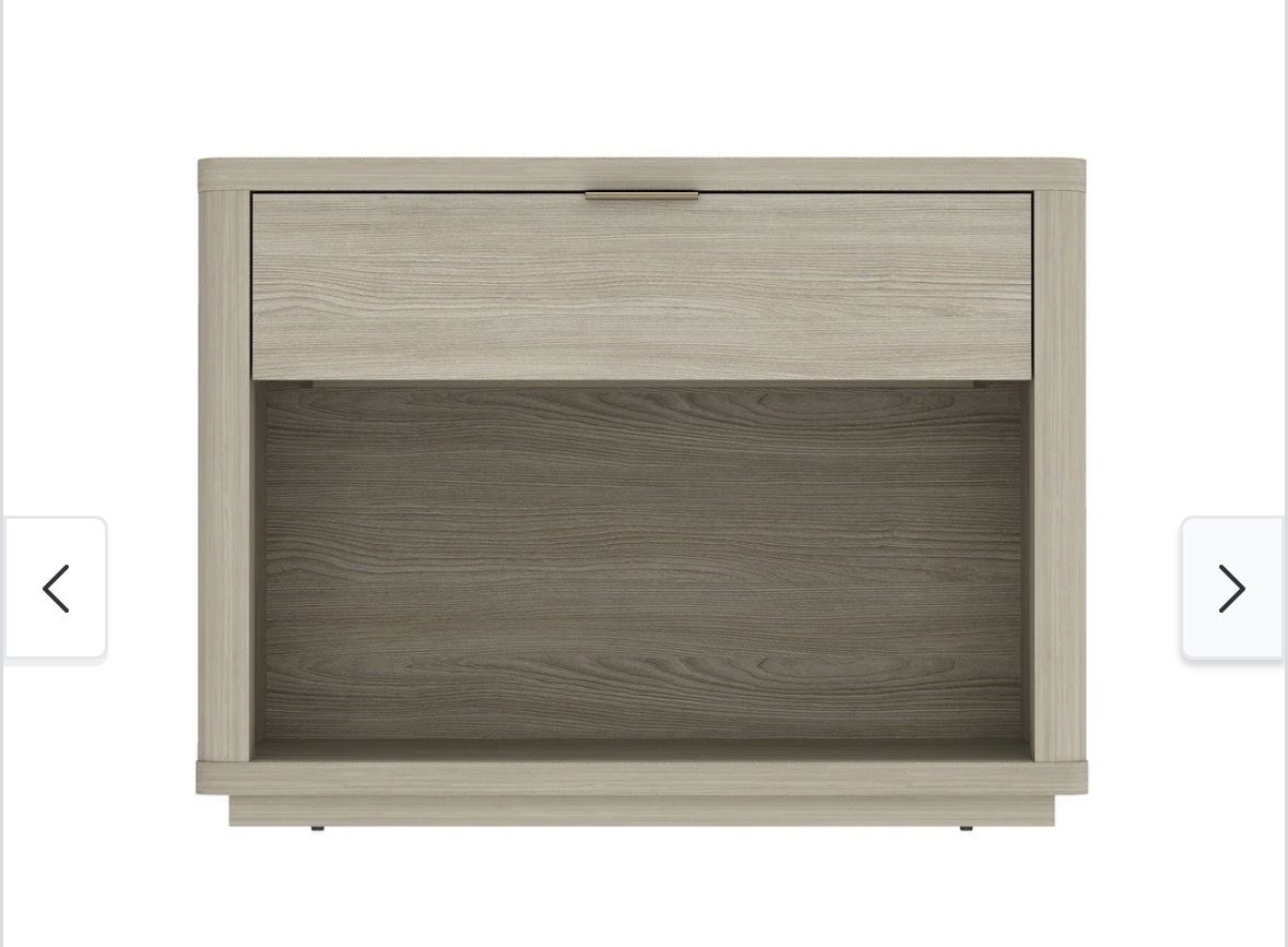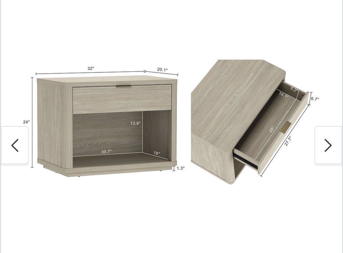 VenmoNew open box. PERFECT SIZE, SIMPLE SETUP Measuring 32L x 20.1D x 24H, this modern nightstand fits beautifully beside your bed or sofa as a stylish accent table. Compact yet roomy, it includes all hardware for fast, stress-free assembly and lasting stability. Engineered Wood MODERN STYLE, MULTIFUNCTIONAL USE With smooth rounded edges and a minimalist silhouette, this modern nightstand doubles as an end table or small dresser perfect for bedrooms, offices, or living spaces needing refined style and smart storage. SMART STORAGE MADE SIMPLE This modern nightstand features a smooth-glide drawer and open shelf for versatile storage perfect for books, electronics, or display items. A compact bedside table that keeps essentials organized while elevating your space. ELEVATED PLATFORM BASE DESIGN A raised mop base adds height, elegance, and practicality making cleaning easy while enhancing airflow and giving this bedside table a sleek floating appearance. Normally 206 on Bed, Bath &Beyond