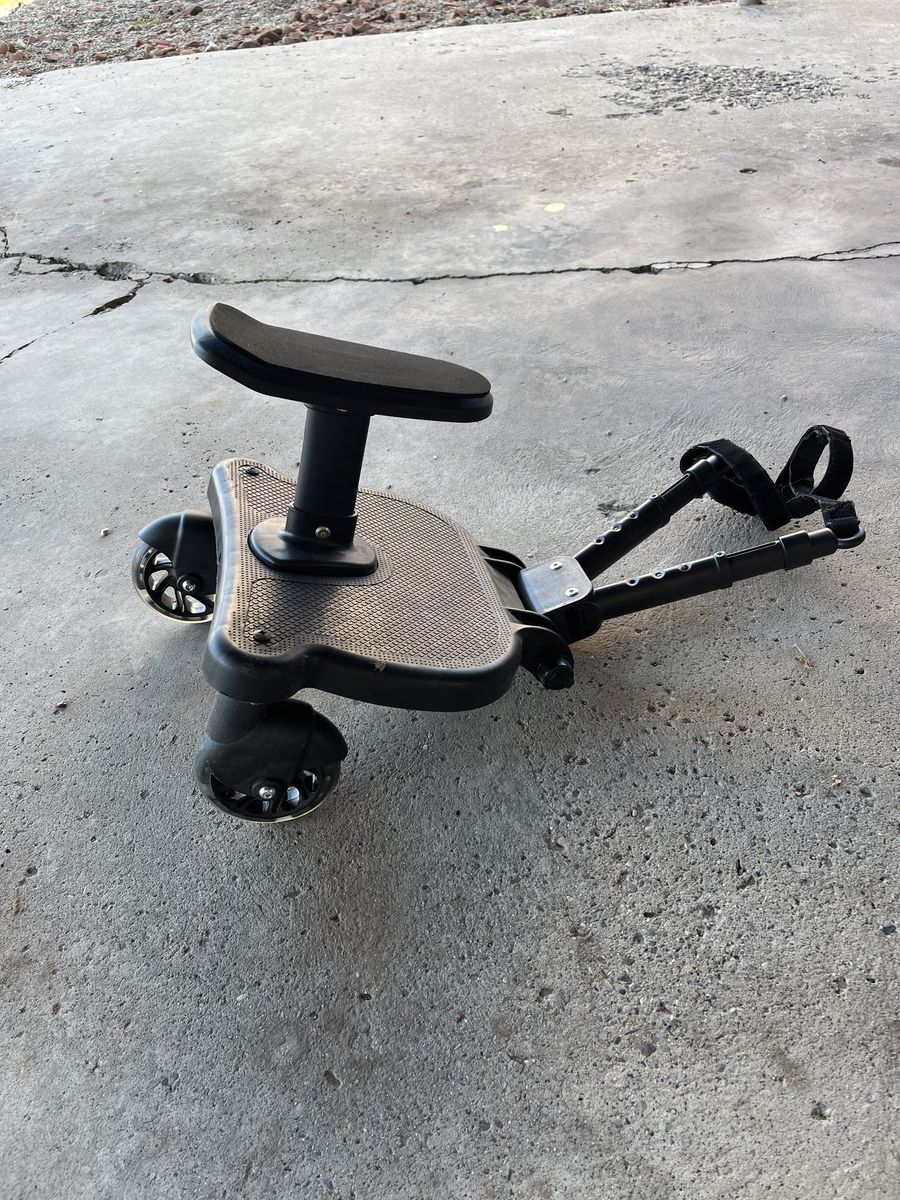Universal stroller board with seat. It attaches to the stroller with Velcro. The arms have three level height adjustments and three angle adjustmen. The board can accommodate to children up to 55 pounds. We didn't use it much because my kid didn't like it.