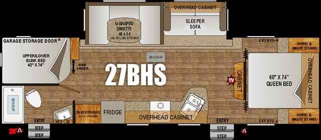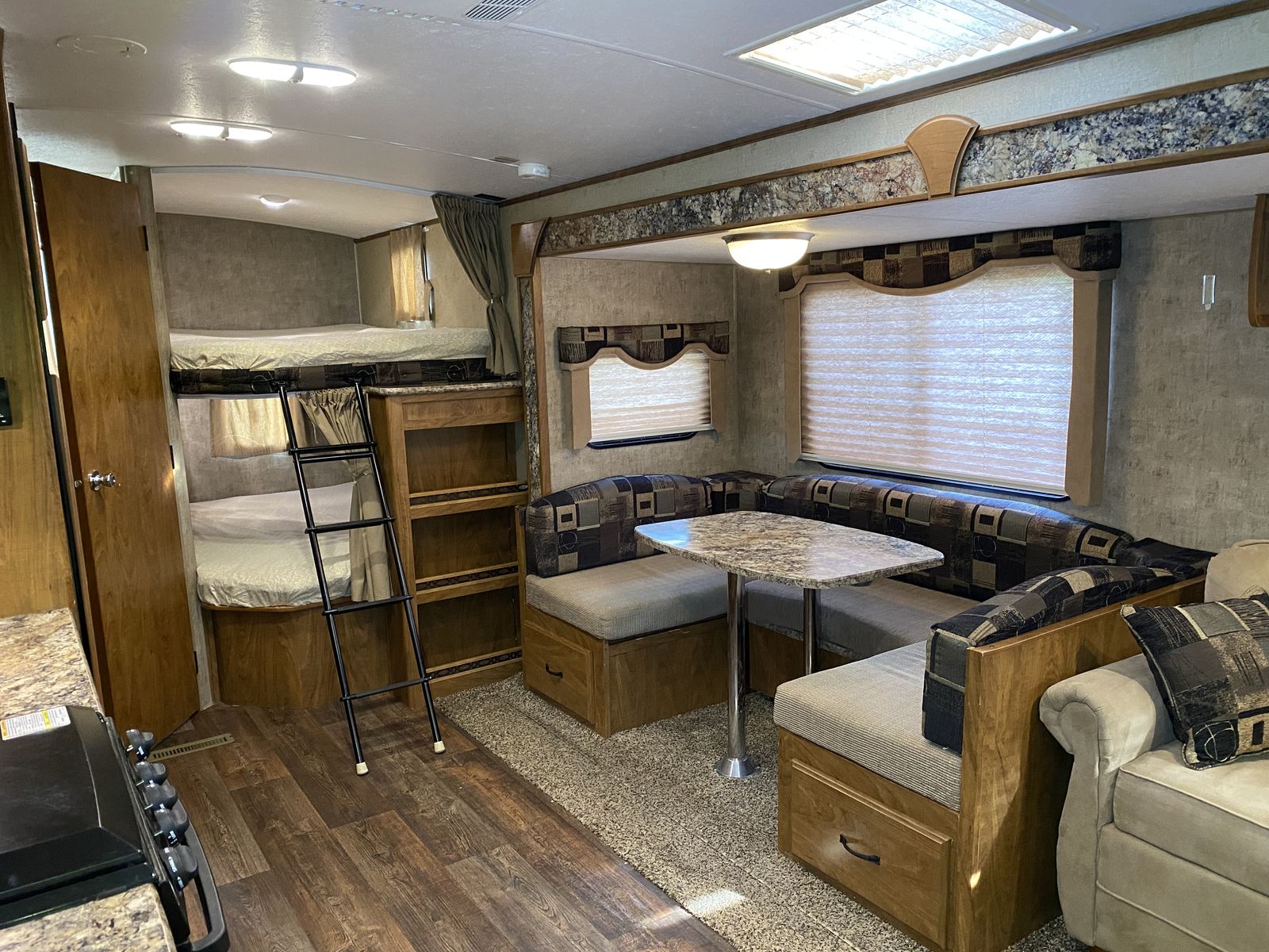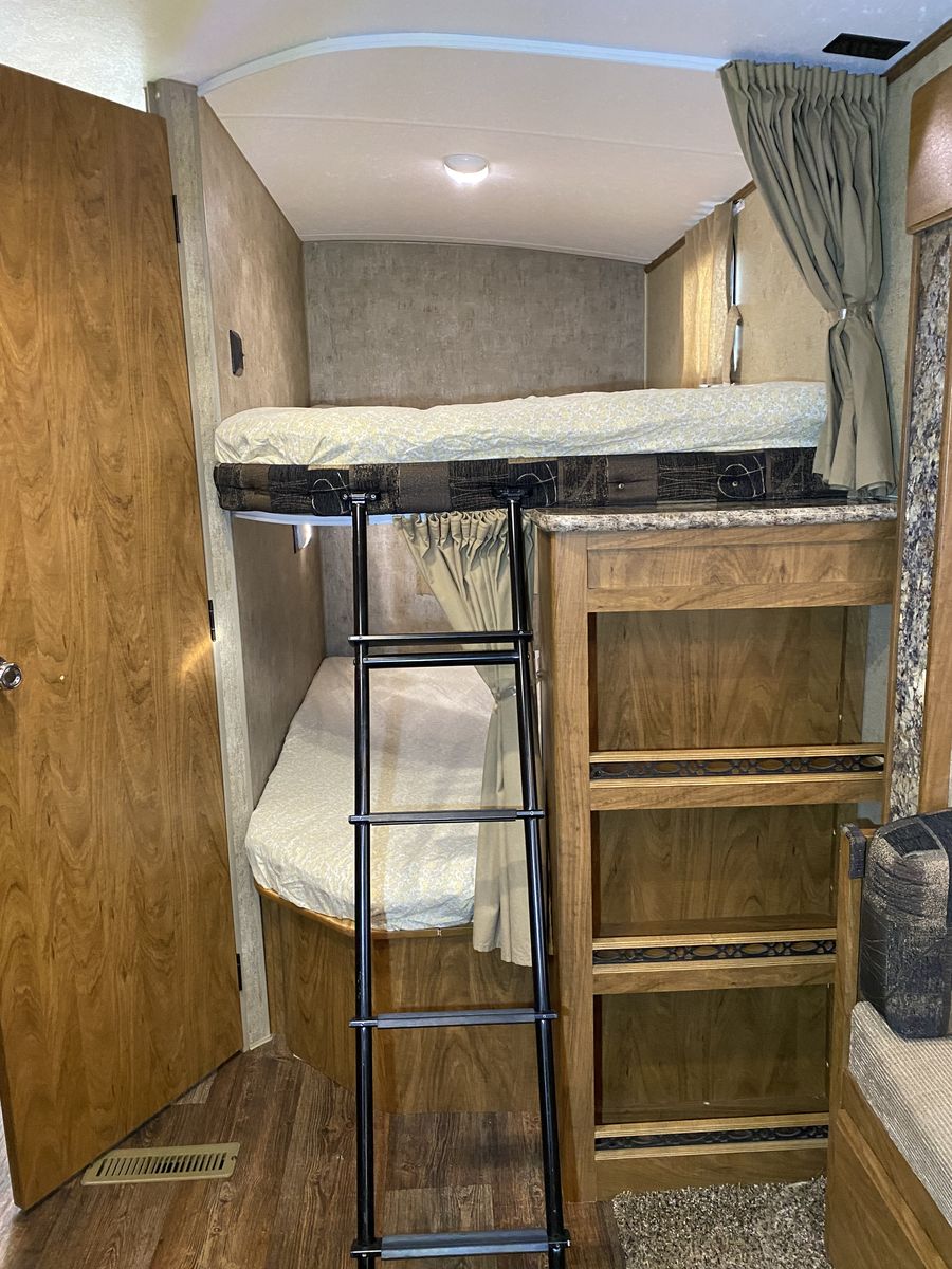 Travel trailer with dual entry, rear bunk beds, and a single slide. As you enter the main entry near the front of this trailer, a bedroom is on your right. You can enter the room from either side of the living room entertainment center via the privacy curtains. The bedroom includes a queen bed, wardrobes over nightstands on each side, and overhead cabinets. The road side wall includes a slide out sleeper sofa with overhead cabinets, and a dinette. A skylight allows natural light into the living/kitchen area. There is an entertainment cabinet with a TV on the interior wall for easy viewing. In the right rear corner of the trailer there are upper and lower bunk beds for additional sleeping space including a ladder. The opposite corner includes a full bathroom featuring a shower with skylight, vanity sink, medicine cabinet, a toilet, and a private entry/exit door to the outside. The kitchen includes a pantry/wardrobe with XL drawers, a refrigerator, a three burner range, overhead cabinets, and an angled double sink along the curb side. Near the outside front of the trailer, you will find exterior storage on each side as well as an awning that covers both entry doors along the curb side.