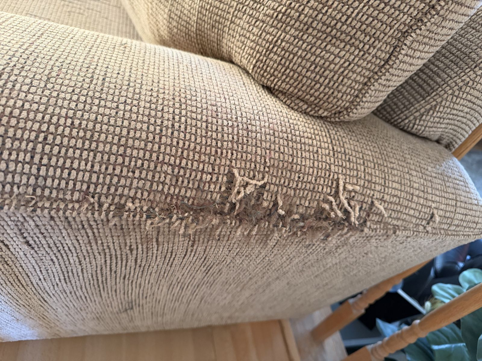 Free full-size sofa, excellent frame/foundation. Upholstery damaged—was used as our cat’s scratching post—see photos. This couch is very comfortable. Just needs a slipcover!