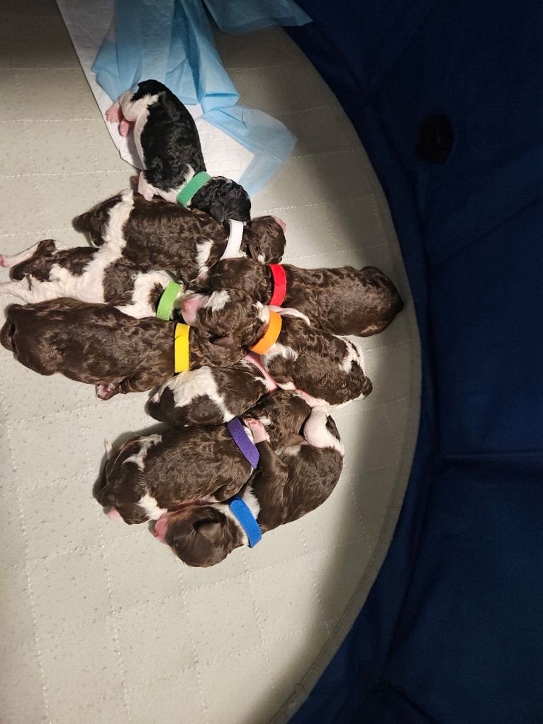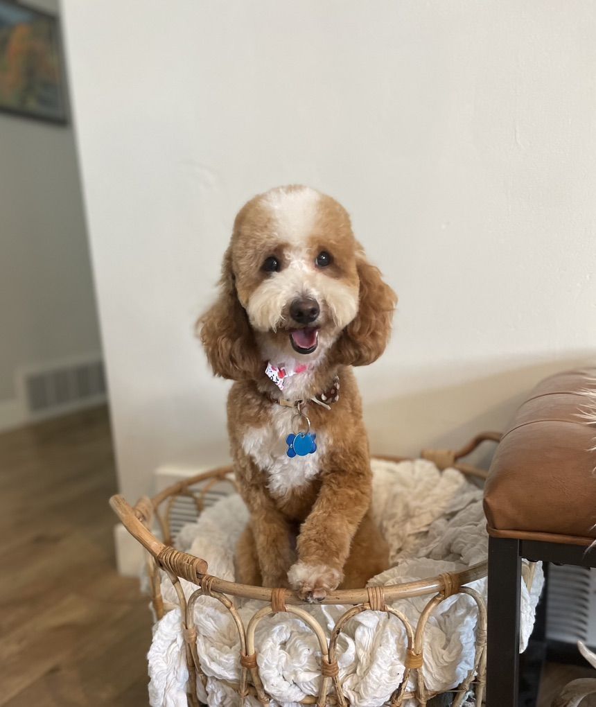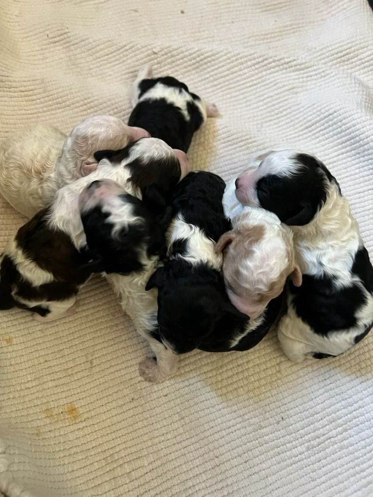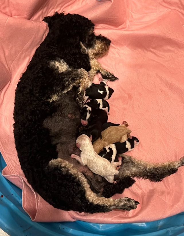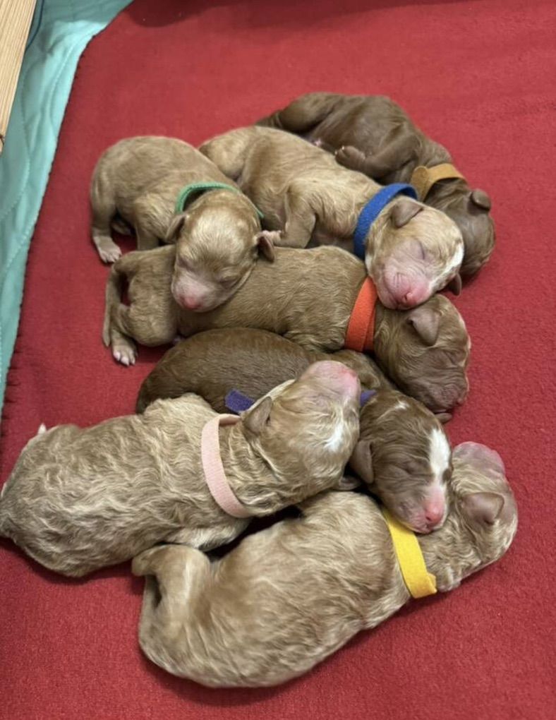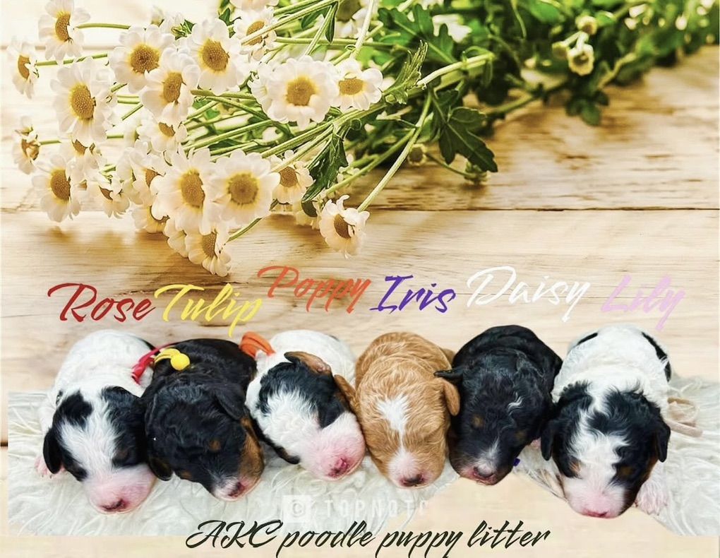 Kobe(on the right) is a phantom mini poodle at about 10lbs. He’s got the kyky atat genetics to make great colors with as well as the phantom look. He’s proven and has had many litters now. He’s got a great personality and is confident and outgoing.