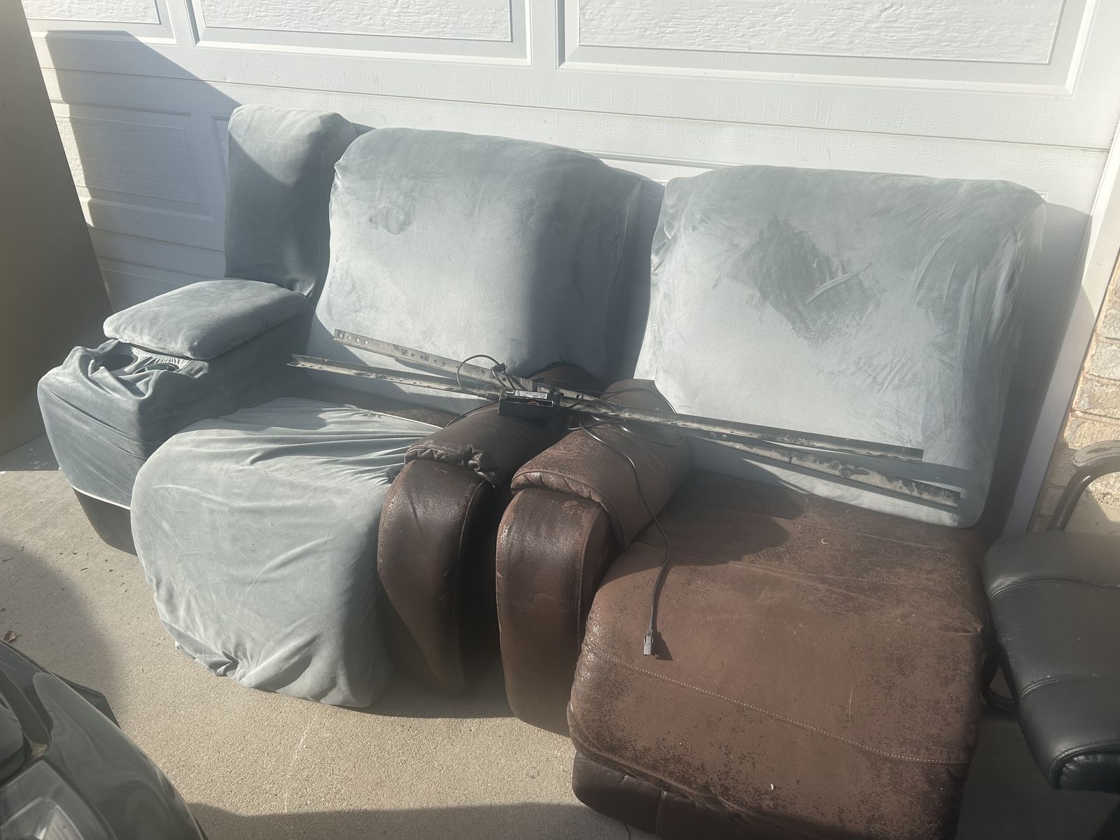 VenmoTwo reclining seats with console in the middle. It has been separated into two pieces just for ease of transport. In the pictures the left side is on the right. The bars on top are what hold it together. All of the hardware is there and ready for a quick assembly. The faux leather has seen better days which is why there is a slipcover on it, but there are no tears.