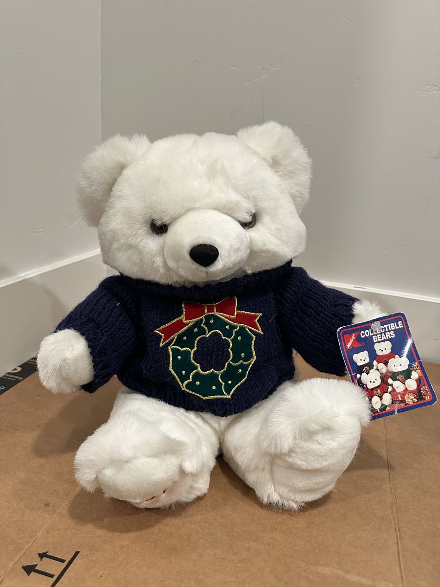 Adorable vintage 1997 Kmart Collectible Bear wearing a festive Christmas wreath sweater. This plush is part of Kmart’s collectible holiday bear series and makes a great addition to any vintage Christmas décor collection or plush collector’s display. #CollectibleTeddyBear #VintageKmartBear #VintageChristmasDecoration #RetroHolidayDecor