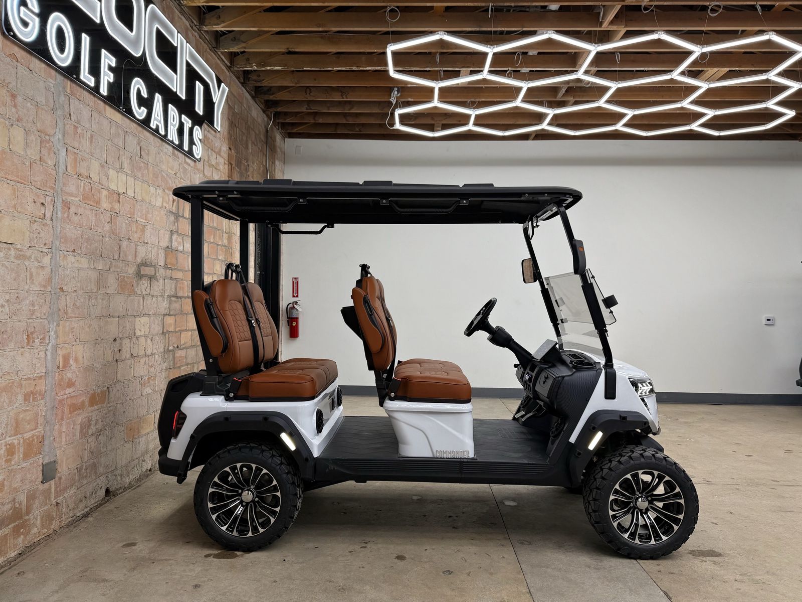Features • 72V ECO Lithium Battery (105Ah) – long life & maintenance-free • 4 forward-facing premium seats with adjustable armrests • Independent front suspension for smooth ride • 14” street tires • Premium multimedia sound system with Apple CarPlay / Android Auto • Backup camera • Wireless phone charger • Adjustable steering column • LED headlights, brake lights & turn signals • Onboard charger – plug in and go • DOT windshield & mirrors (street-legal ready depending on setup)
