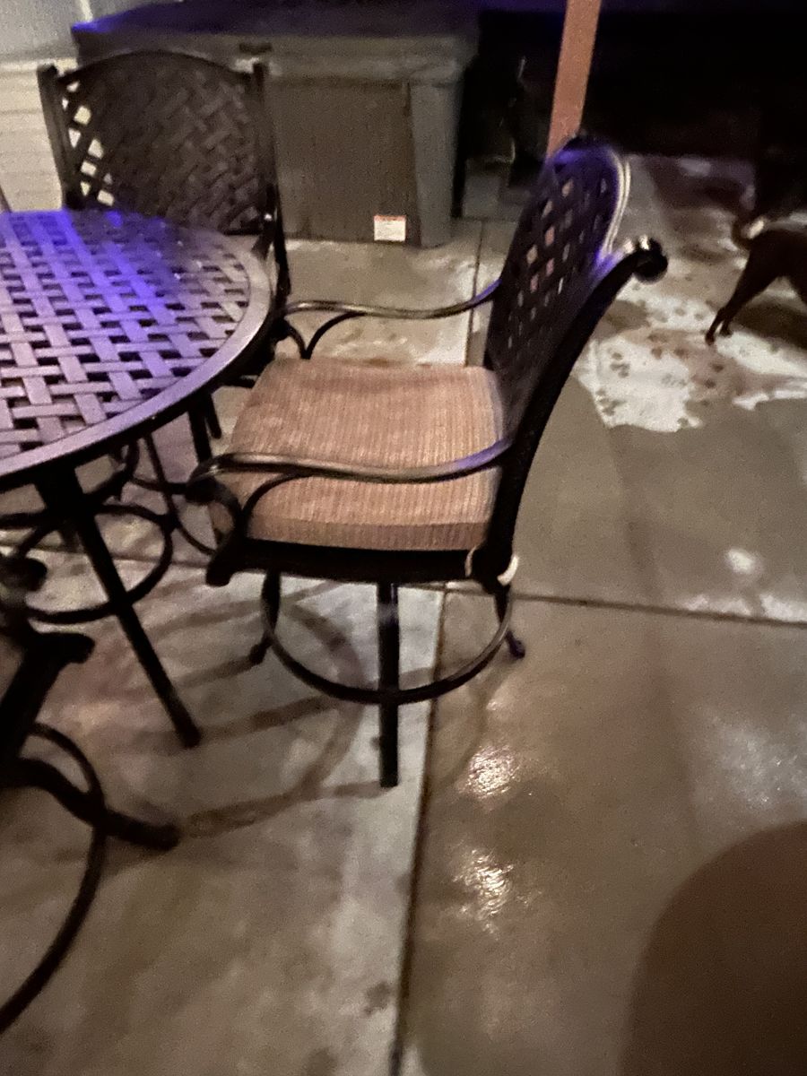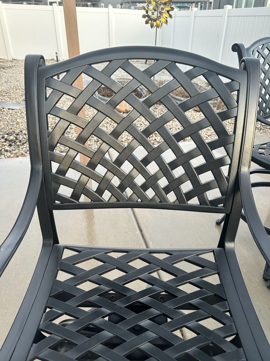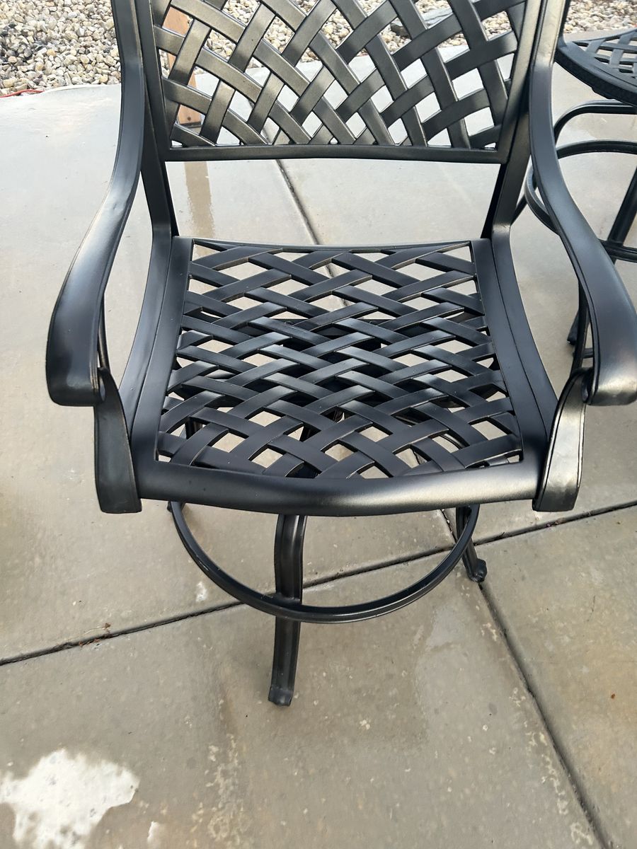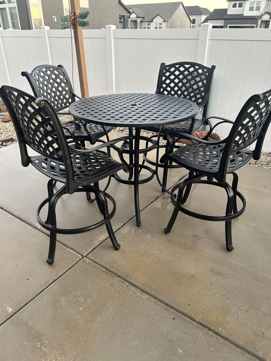 PayPalNassau Outdoor Patio 5pc Bar Set Dark Bronze Cast Aluminum. 4 Nassau Swivel Barstools 30 Seat Height, Cast Aluminium Powder Coated Premium Quality Rust free. Seat cushions included, Walnut Color This set is in excellent condition.