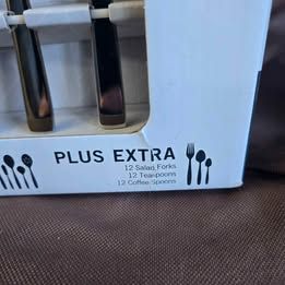 ZelleNew in box 101 piece flatware set by Mikasa. Setting for 12 including bonus utensils. Everett style in stainless steel. Asking $105