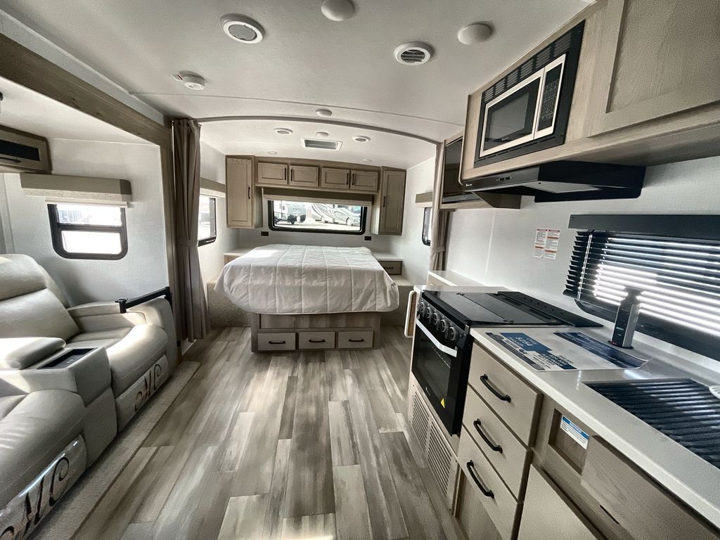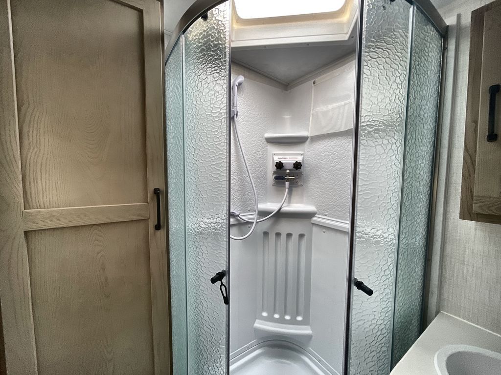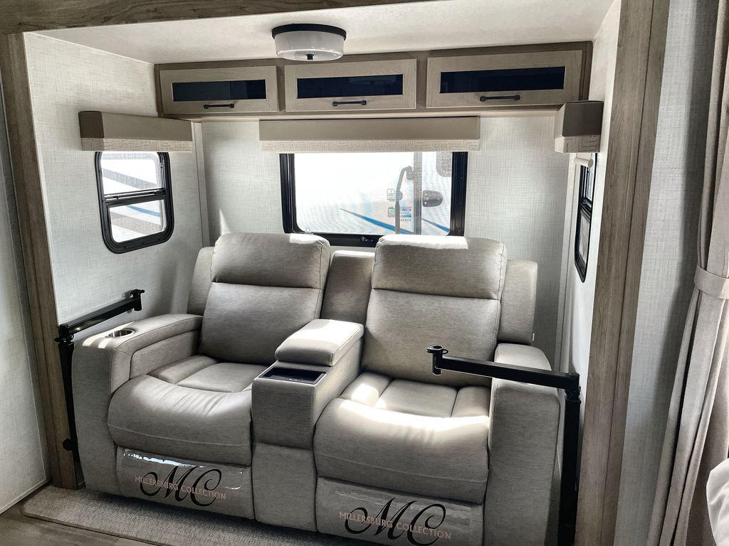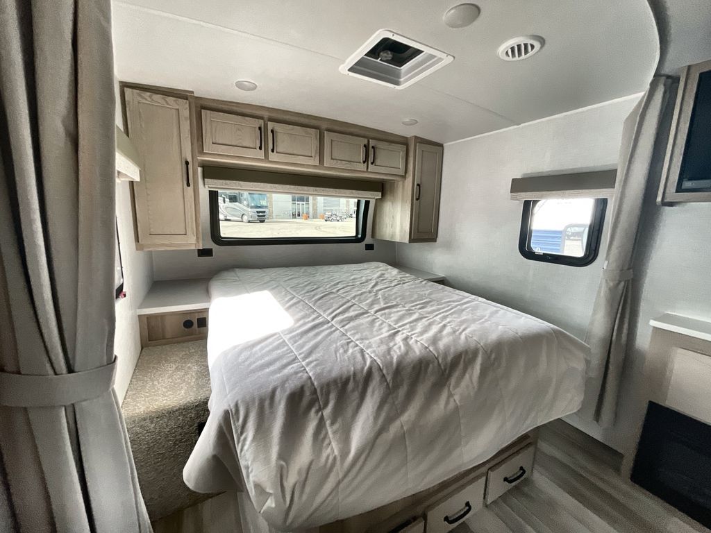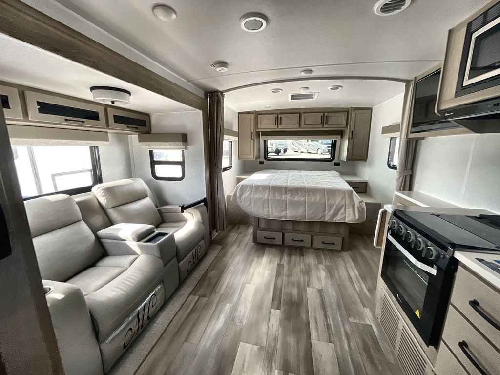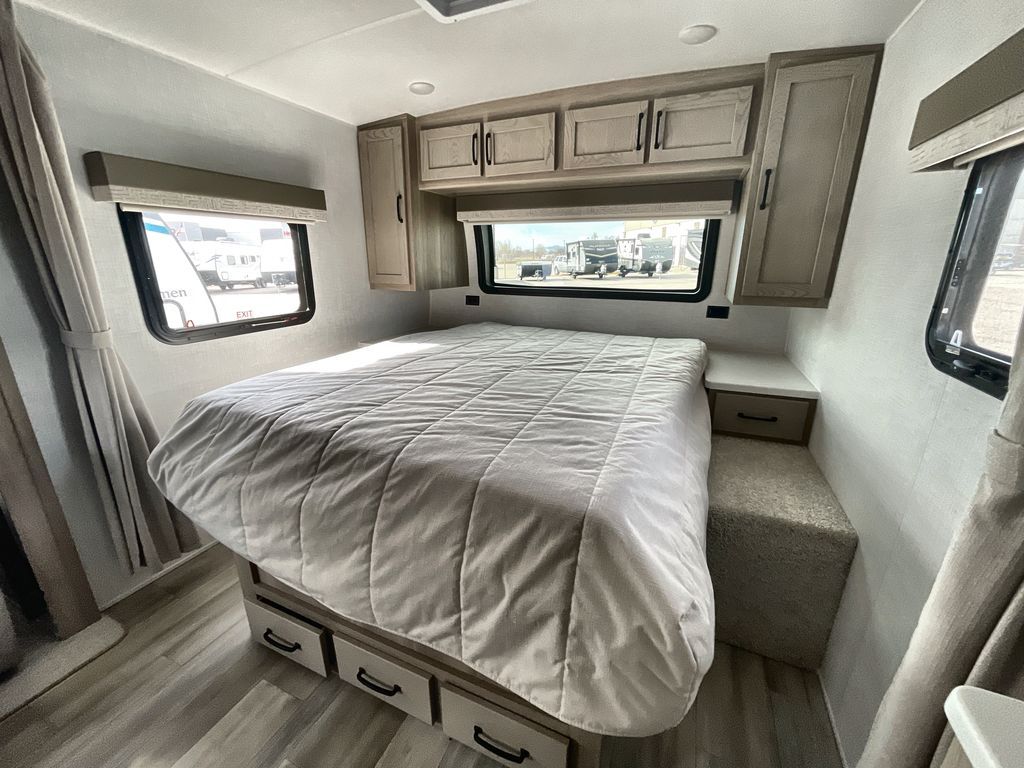 Just the two of you? This may be the perfect camper. Large wall slide for ample floor space with Theater Seating. Queen size bed with underneath storage. Lots of counter space for meal prep. Like new condition.