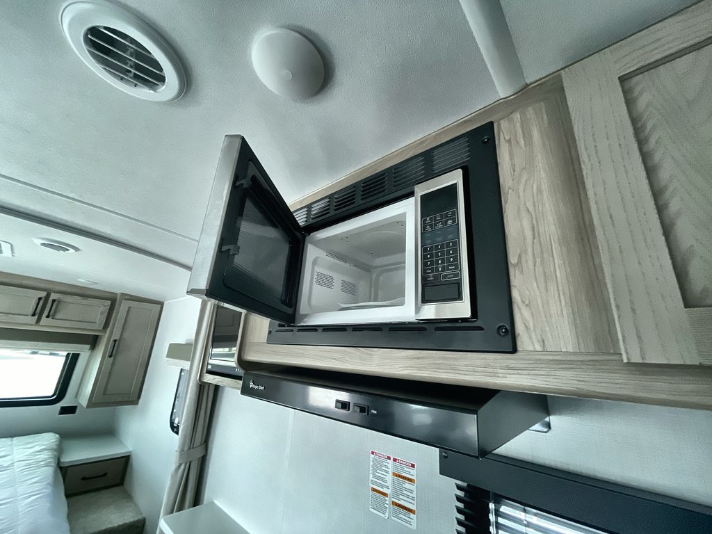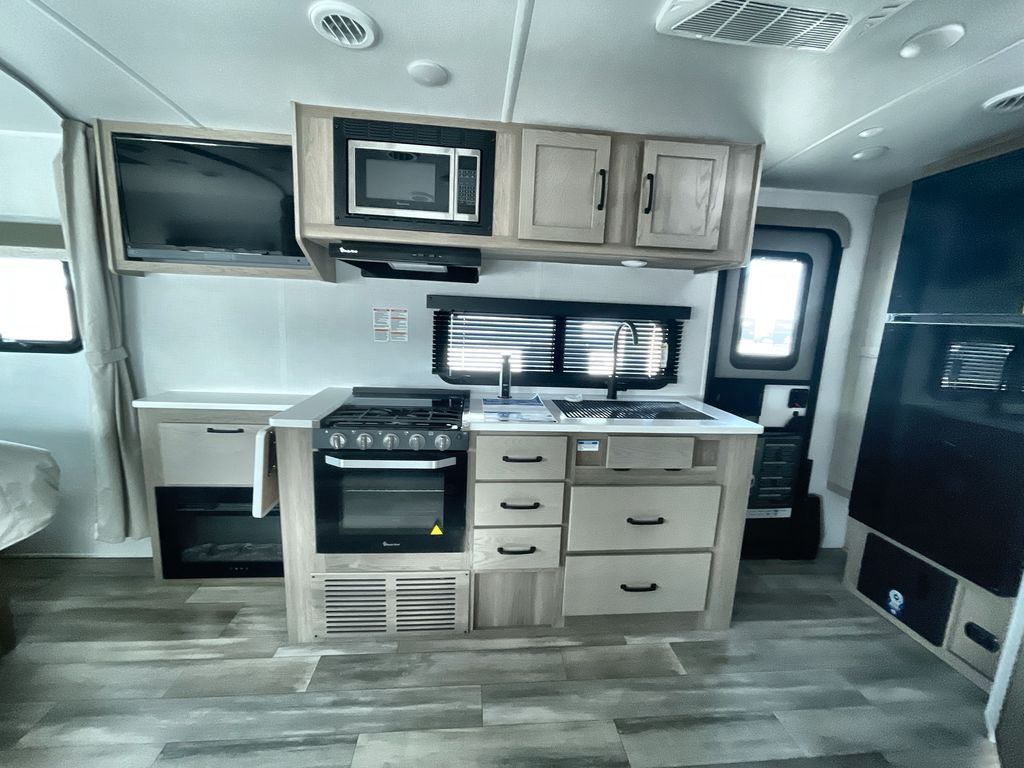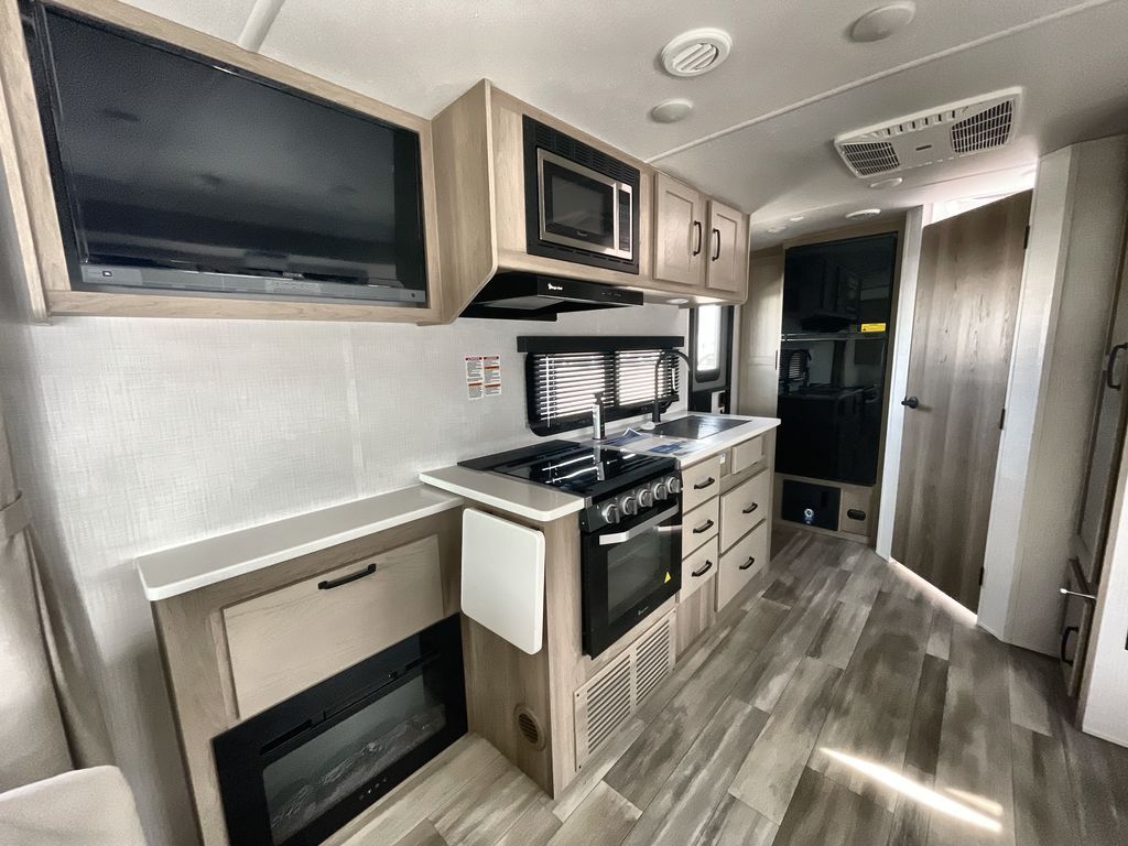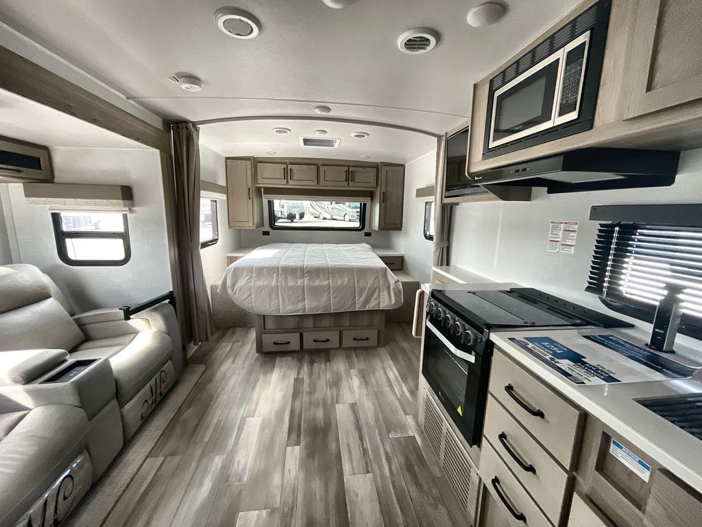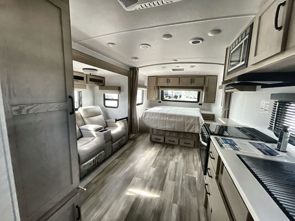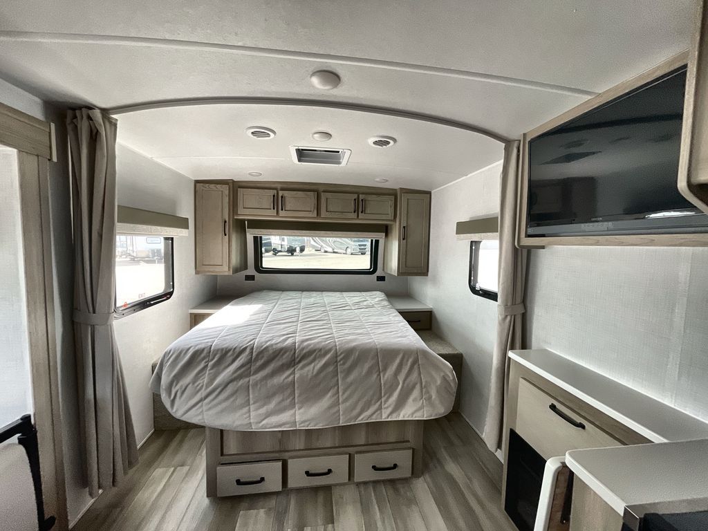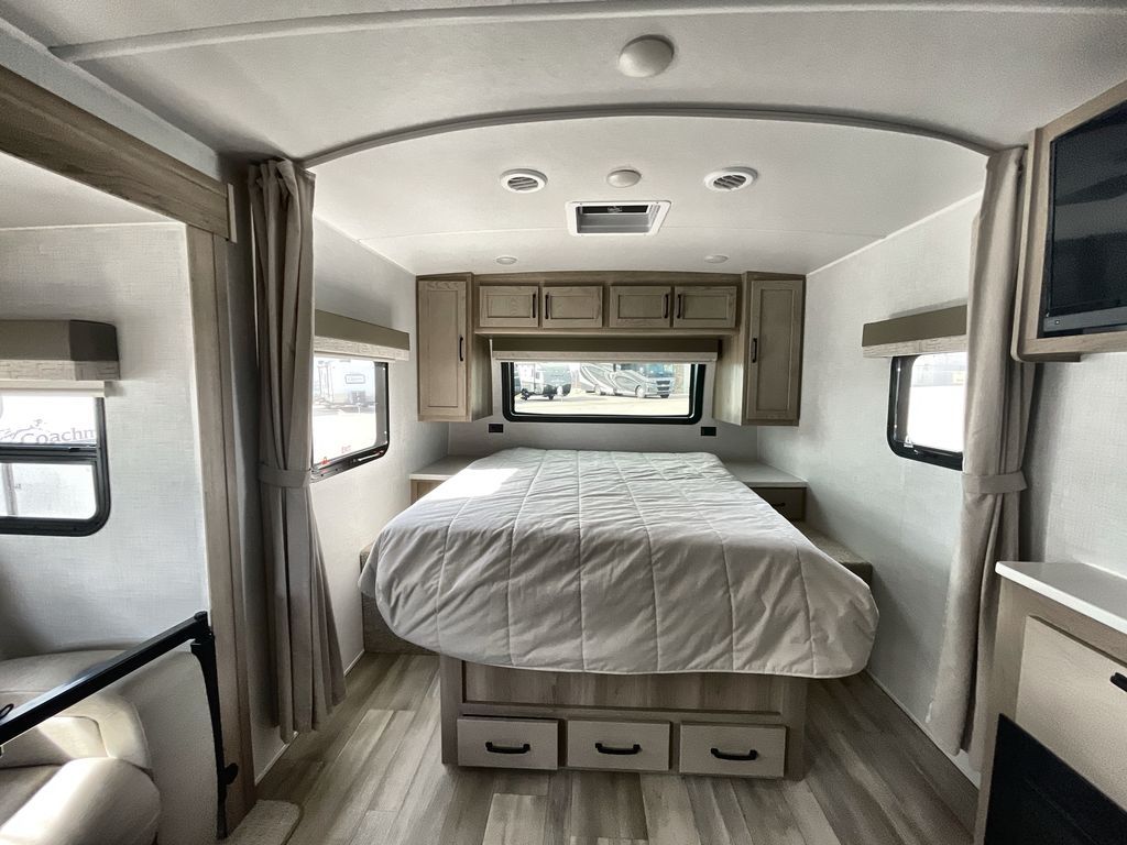 Just the two of you? This may be the perfect camper. Large wall slide for ample floor space with Theater Seating. Queen size bed with underneath storage. Lots of counter space for meal prep. Like new condition.