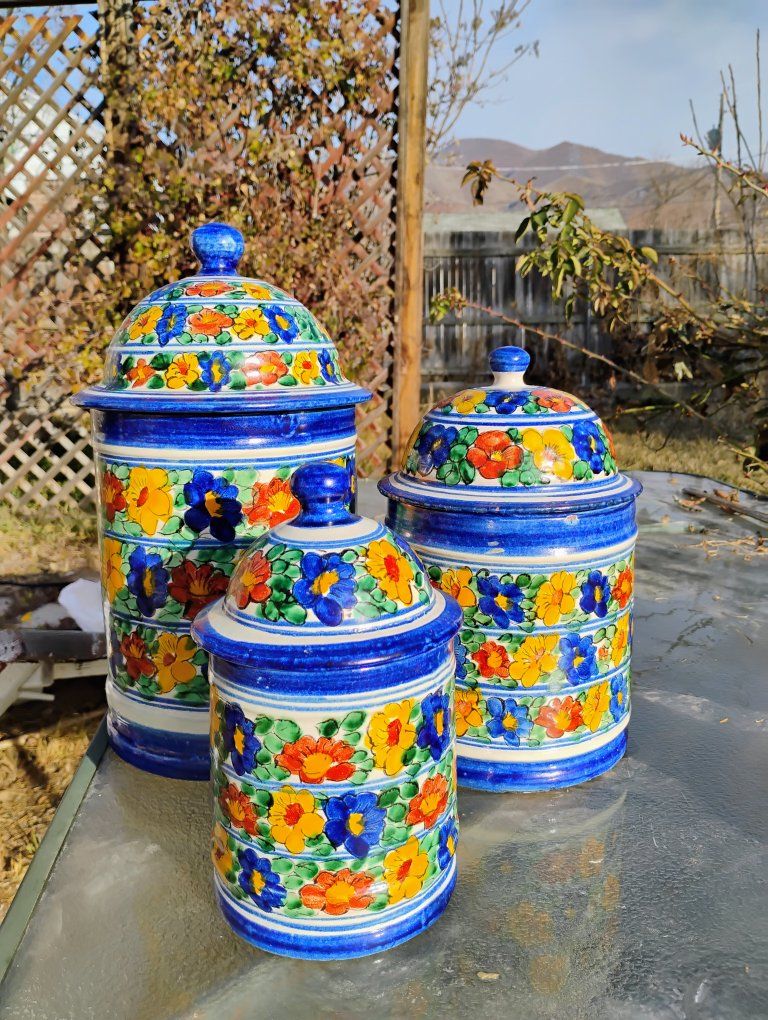 This is a hand-painted kitchen canister. The vibrant, floral patterns are characteristic of traditional Mexican pottery. These canisters are in good used condition. The price is $25 for all 3. We will meet near Foothill village. I don't have venmo, I take cash only. Thanks for looking.