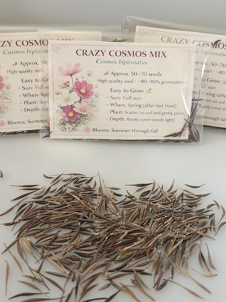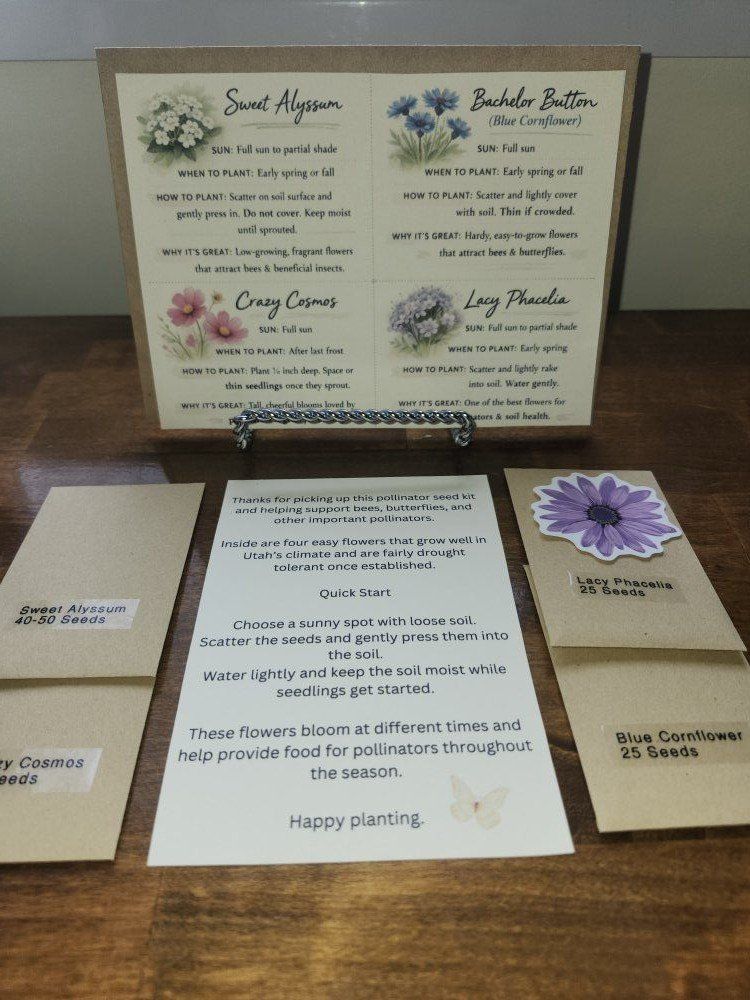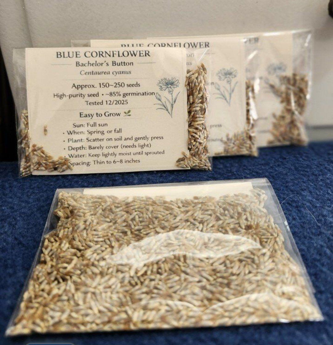 Garden & Seeds Pollinator seed shaker – $12 Mammoth Sunflower Plant – $5 Sunflower seeds (Gray Stripe Mammoth) • 50 seeds – $5 • 100 seeds – $8 Blue cornflower seeds – $5 Cosmos seed mixes – $5